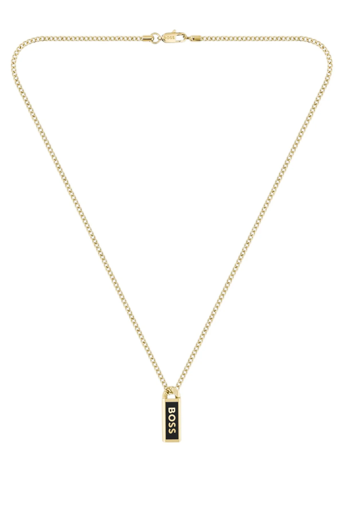 DETAILS KASSY EMBLEM - HB1580678 With its ink-filled logo pendant and curved chain, this BOSS Jewelry necklace adds a modern touch to any look. Gold-tone effect. QUALITY & CARE INSTRUCTIONS Quality: 100% Stainless steel