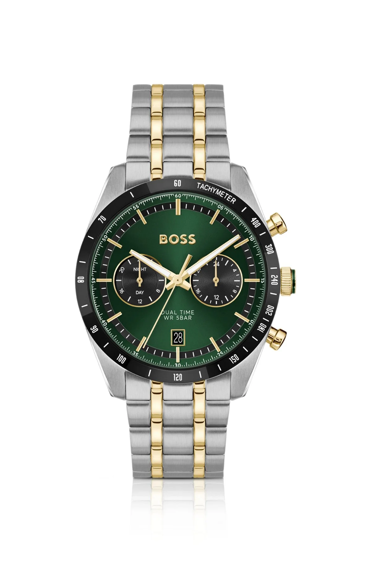 DETAILS With a multi-level, green dial inside domed glass, this BOSS Menswear watch fuses heritage and racing-inspired style. Sporty tachymeter. Two-tone steel bracelet. Dial color: green Strap material: Stainless steel Closure: Push-button deployment Case size: 1.61 in (41 mm) (0 inches) Water Resistance (in ATM): 5 ATM TOURMASTER - 58564947 QUALITY & CARE INSTRUCTIONS Material: 100% Stainless steel