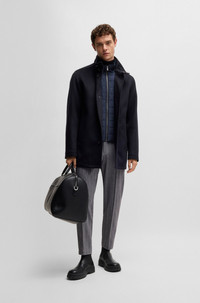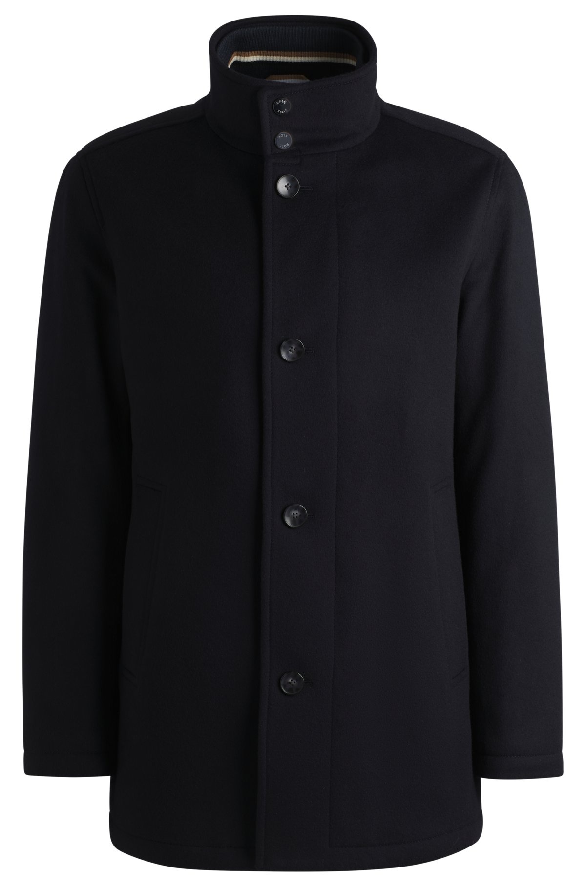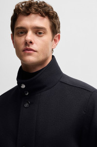 SIZE AND FIT The model wears a size 40R and is 6'2" tall with a, 37" chest, 31" waist and 37" hips. DETAILS H-Coxtan-234 - 50525750 A refined short coat with a stand collar by BOSS. This relaxed-fit style – in wool and cashmere – features a padded inner bib. Relaxed fit Stand collar Fully lined Short length Fit back length: 84 cm (33 inches) QUALITY & CARE INSTRUCTIONS Do Not Wash Do Not Tumble Dry Iron Low Heat Do Not Bleach Reduced Dry Clean Quality: 90% Virgin wool, 10% Cashmere, Lining: 100% Polyamid, Facing: 100% Polyester, Sleeve lining: 100% Polyester, Wadding: 95% Polyester, 5% Polyamid, body wadding: 100% Polyester