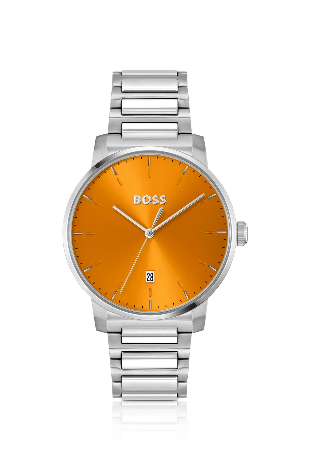 DETAILS DEAN - 58137067 A stainless-steel watch by BOSS Menswear. The minimalist dial balances bright-orange sunray brushing with understated index markers for a modern aesthetic. Watch mechanism: Three-hand Strap material: Stainless steel Closure: Push-button deployment Case size: 1.61 in (41 mm) (0 inches) Water Resistance (in ATM): 5 ATM QUALITY & CARE INSTRUCTIONS Quality: 100% Stainless steel