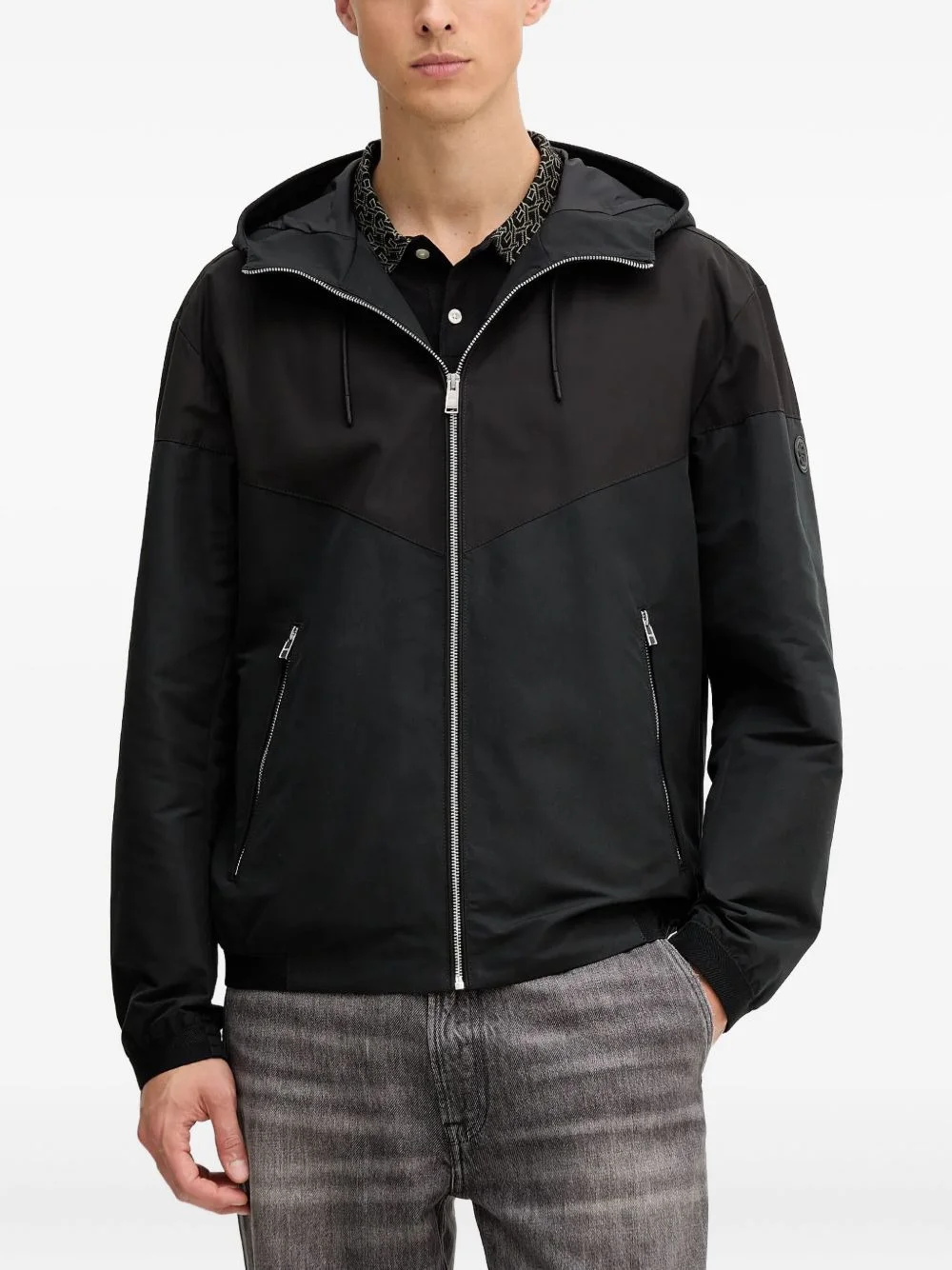 hooded zip-front jacket Highlights - Black - Hooded neckline - Zip front fastening - Welt pockets - Contrast panels Imported Composition Recycled Polyester 100%, Recycled Polyamide 100% Washing instructions Read Manufacturer Guidelines