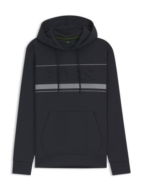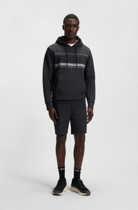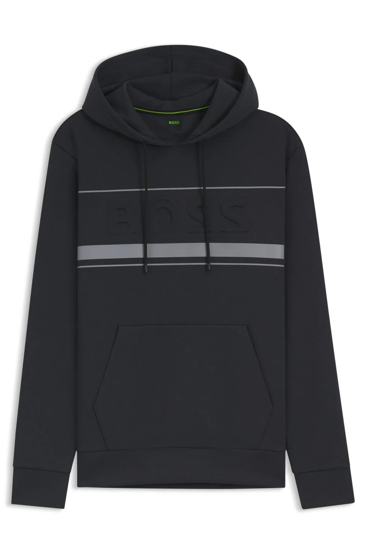 DETAILS Soody Zone - 50545244 In interlock with stretch, this straight-fit BOSS Menswear hoodie is a modern casual layer. Molded logo and sporty stripes. Regular fit Neckline: Hooded Pockets top: Kangaroo pocket Long sleeves Ribbed cuffs Standard length QUALITY & CARE INSTRUCTIONS Quality: 62% Cotton, 33% Polyester, 5% Elastane, pocketing: 100% Polyester Machine Wash Cold Gentle Do Not Dry Clean Do Not Tumble Dry Do Not Bleach Iron Low Heat