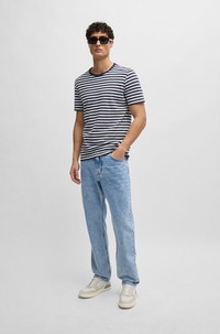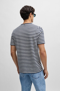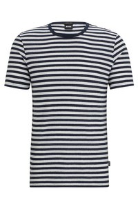 SIZE AND FIT The model wears a size M and is 6'1" tall with a, 36" chest, 29" waist and 34" hips. DETAILS Tiburt 457 - 50513401 A regular-fit T-shirt by BOSS Menswear, crafted in horizontally striped material made from cotton and linen for fresh comfort. Regular fit Neckline: Crew neck Short sleeves Standard length QUALITY & CARE INSTRUCTIONS Iron Low Heat Quality: 52% Cotton, 48% Linen Do Not Bleach Cold, gentle machine wash; reduced spin speed. Do Not Tumble Dry Do Not Dry Clean