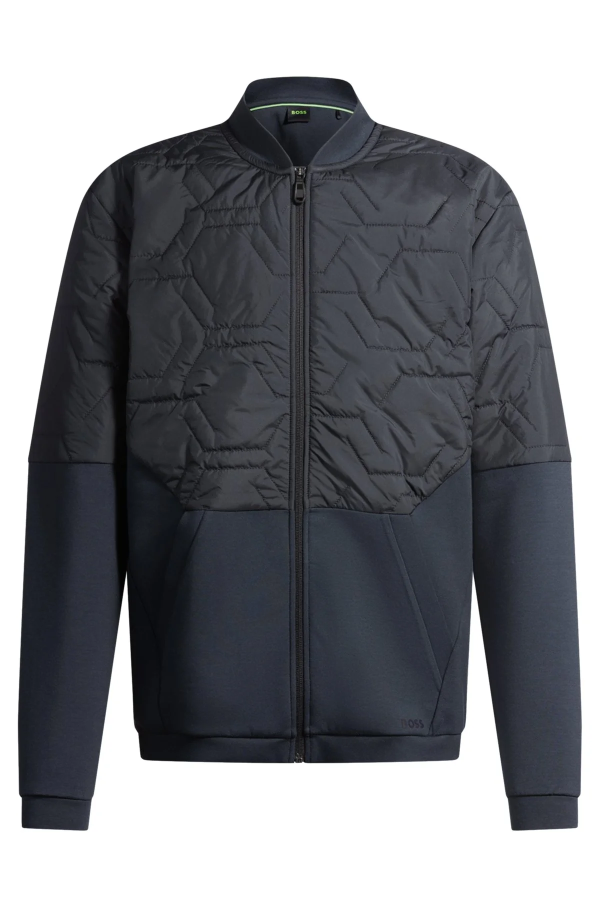 SIZE AND FIT The model wears a size M and is 6'2" tall with a, 36" chest, 28" waist and 36" hips. DETAILS Samoo Tech Hybrid - 50537409 A regular-fit sweatshirt in mixed fabrics with mesh lining by BOSS Menswear. This piece is designed in a mix of quilted material and stretch fabric. Regular fit Neckline: College collar Fastening top: Zip closure Pockets top: Side-entry pockets Long sleeves Standard length QUALITY & CARE INSTRUCTIONS Iron Low Heat Do Not Dry Clean Machine Wash Cold Gentle Do Not Bleach Do Not Tumble Dry Quality: 39% Cotton, 36% Modal, 17% Polyester, 8% Elastane, Wadding: 100% Polyester, upper part: 100% Polyester