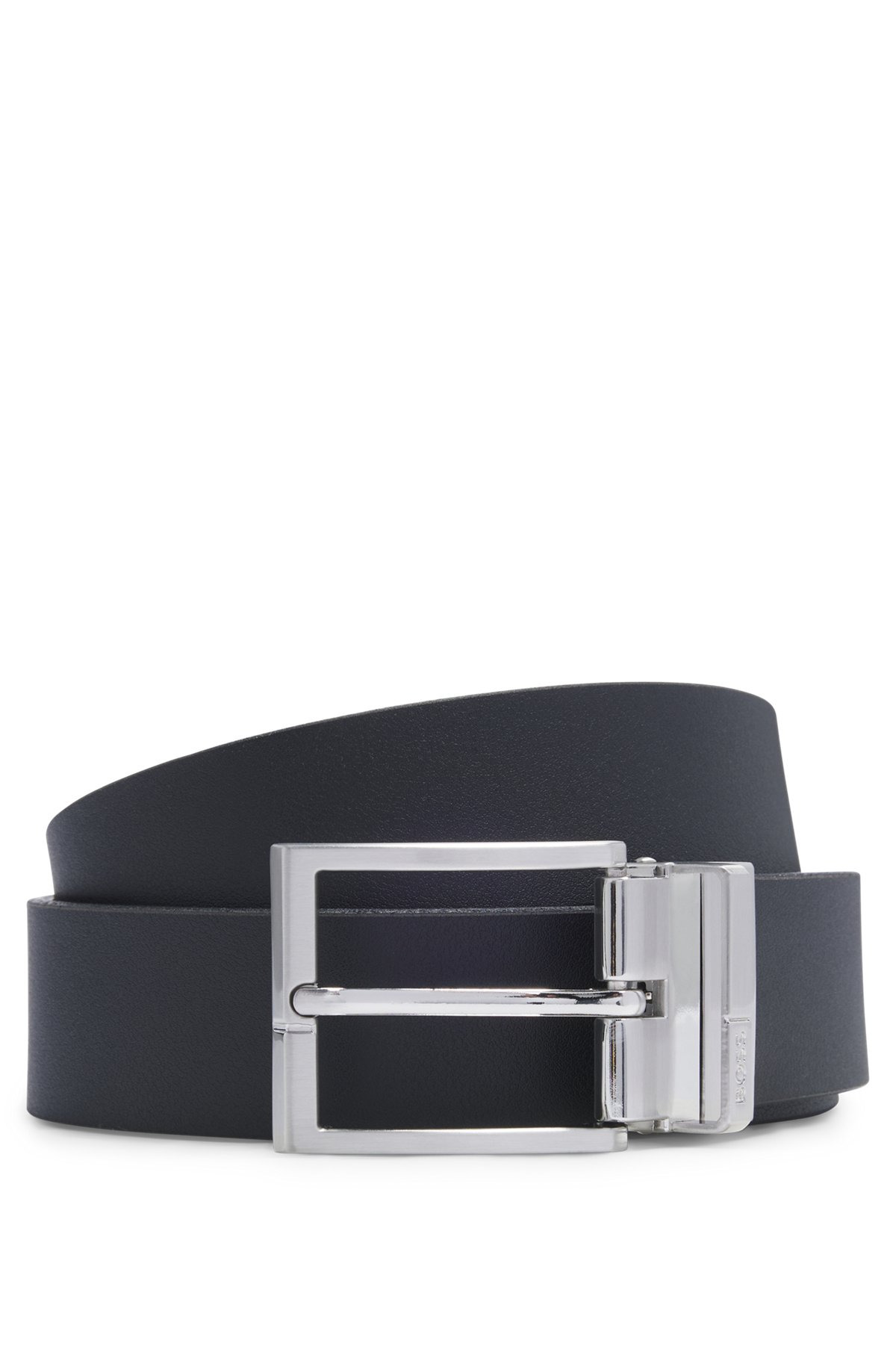 SIZE AND FIT The model wears a size pce. and is 6'2" tall with a, 37" chest, 30" waist and 37" hips. DETAILS Geppy-Soft_Gb35_pp - 50537100 A 3.5cm belt made in Italy by BOSS Menswear. Featuring pin and plaque buckles, this reversible accessory is crafted in rich Italian leather. Engraved logo on closure Width: 3,5 cm (1.4 inches) Hardware finishing: Brushed silver hardware Unlined QUALITY & CARE INSTRUCTIONS Quality: 100% Cow leather
