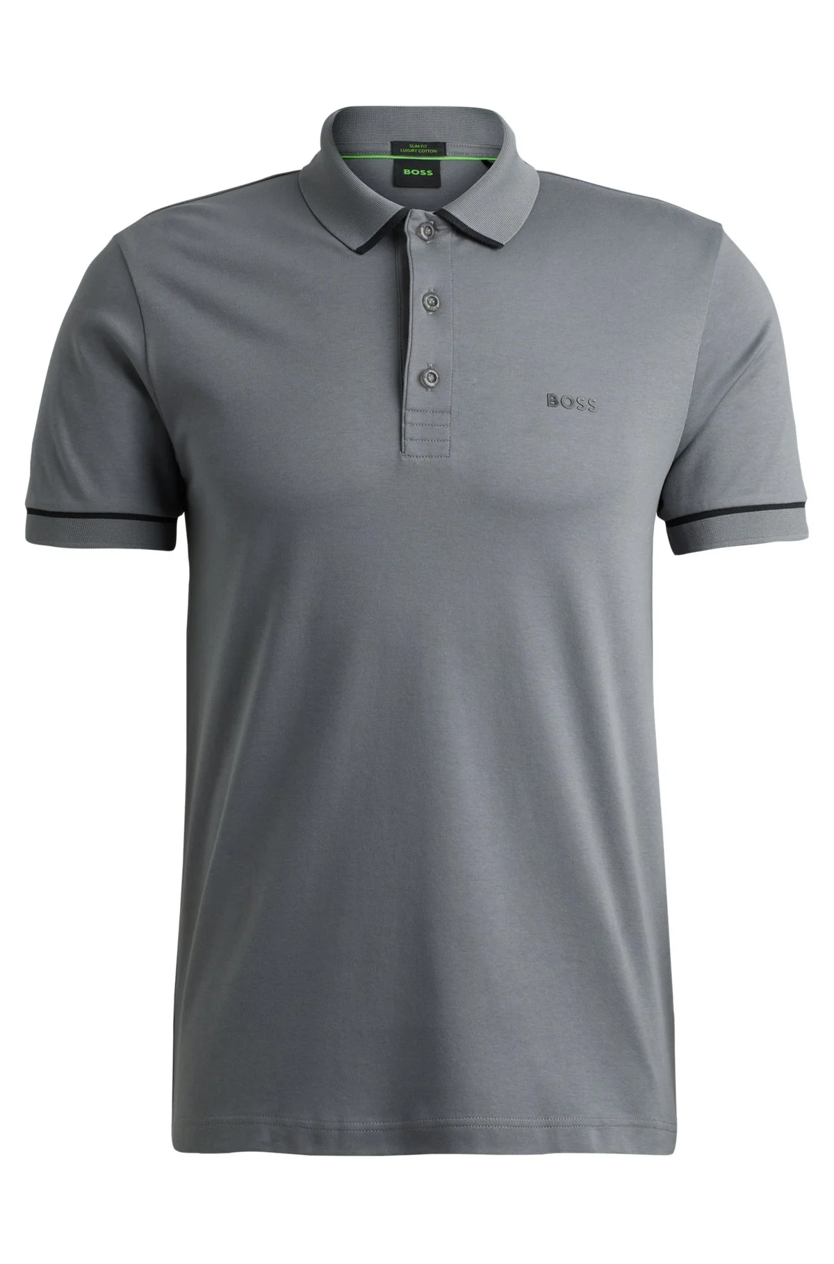 SIZE AND FIT The model wears a size M and is 6'1" tall with a, 37" chest, 29" waist and 37" hips. DETAILS Paule - 50519720 A premium polo shirt by BOSS Menswear. Featuring contrast tipping and a logo print, this slim-fit top is engineered in soft interlock cotton. Slim fit Neckline: Flat-knit collar Number of buttons: 3 Short sleeves Flat-knit cuffs Standard length QUALITY & CARE INSTRUCTIONS Do Not Bleach Do Not Tumble Dry Quality: 100% Cotton Do Not Dry Clean Iron Low Heat Machine Wash Cold Gentle