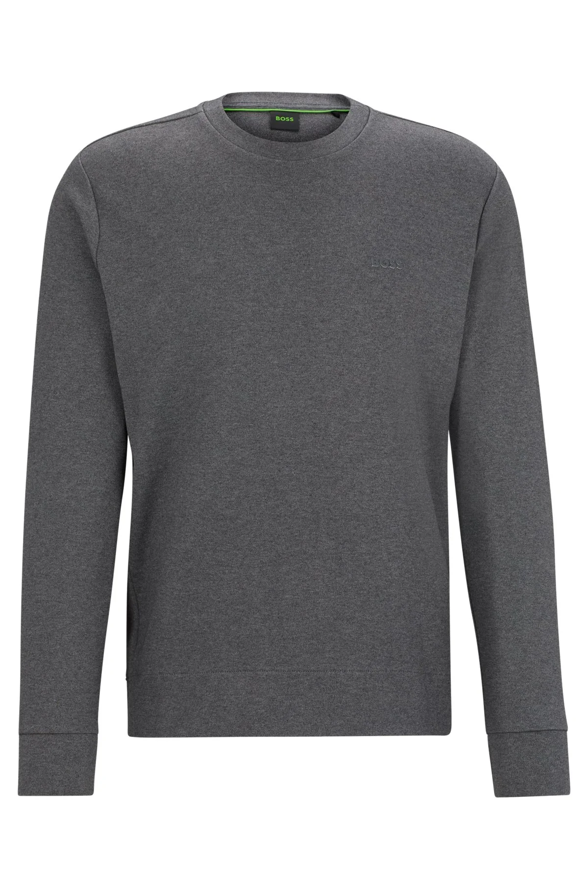 SIZE AND FIT The model wears a size L and is 6'2" tall with a, 37" chest, 28" waist and 37" hips. DETAILS Salbo X - 50493719 A signature sweatshirt in interlock cotton with a crew neckline and subtle logo detail by BOSS Menswear. Regular fit Long sleeves Standard length QUALITY & CARE INSTRUCTIONS Iron Low Heat Machine Wash Cold Gentle Quality: 100% Cotton Do Not Bleach Do Not Tumble Dry Do Not Dry Clean