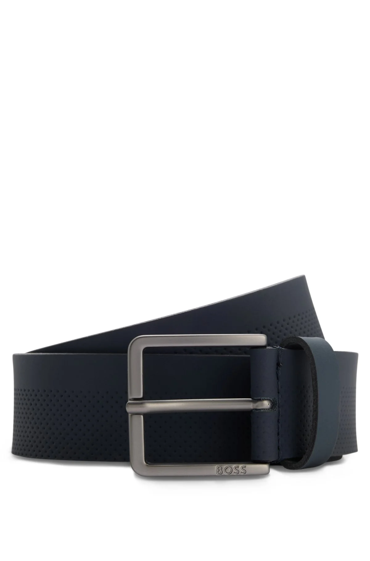 SIZE AND FIT The model wears a size 36 and is 6'1" tall with a, 36" chest, 29" waist and 36" hips. DETAILS Crafted in finest Italian leather, this 3.5cm BOSS Menswear belt makes a sporty impact with its perforated strap. Logo-engraved pin buckle. Made in Italy. For the best fit, we advise ordering a belt one size larger than your waist size. Fully lined Engraved logo on closure Ther-Drill_Sz35 - 50553303 QUALITY & CARE INSTRUCTIONS Quality: 100% Cow leather