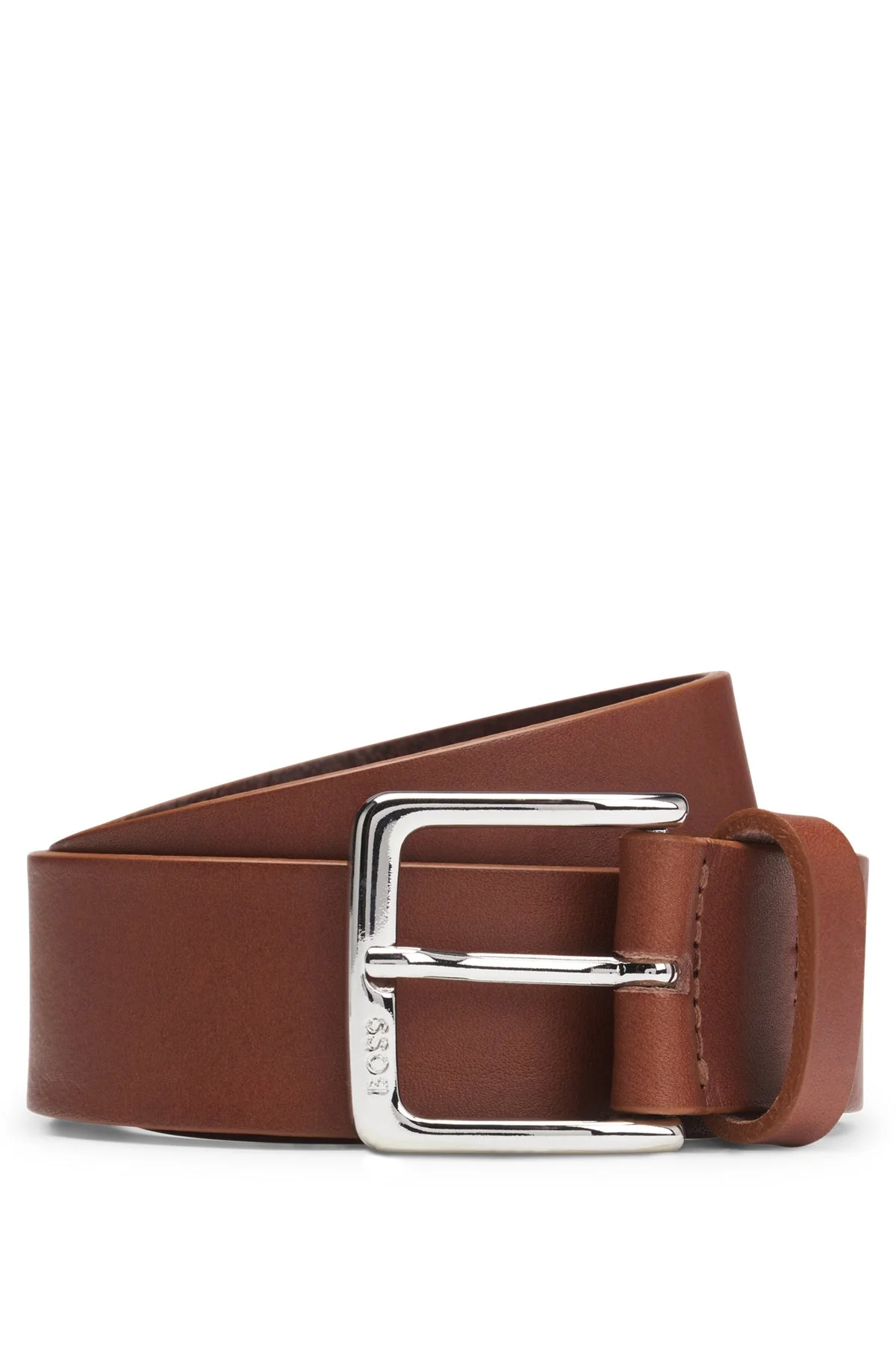 SIZE AND FIT The model wears a size 34 and is 6'1" tall with a, 32" chest, 28" waist and 34" hips. DETAILS Ronnie-V_Sz35 - 50542192 With its smooth leather and polished buckle, this 3.5cm BOSS Menswear belt will go with any look. Expertly crafted in Italy. For the best fit, we advise ordering a belt one size larger than your waist size. Engraved logo on closure Width: 3,5 cm (1.4 inches) Hardware finishing: Polished silver hardware Partially lined QUALITY & CARE INSTRUCTIONS Quality: 100% Cow leather