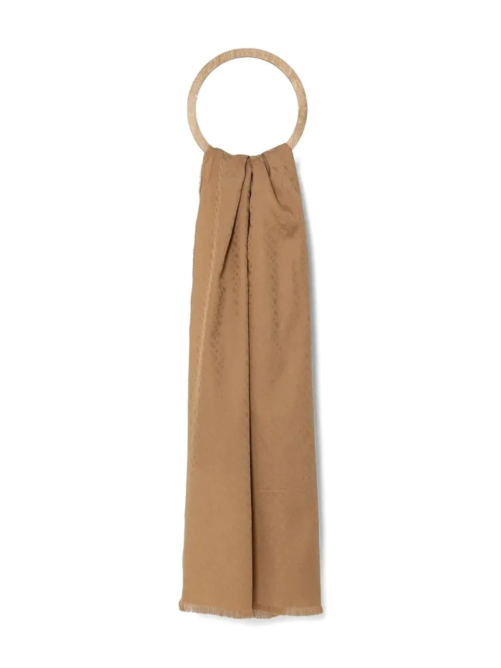 jacquard scarf Highlights - Warm brown - Circular wooden handle - Lightly fringed edges - Smooth finish - Flowing design - Versatile styling options Imported Composition Cotton 63%, Wool 37% SIZE & FIT Measurement LENGTH 70.86 in(180 cm) WIDTH 22.83 in(58 cm) Washing instructions Read Manufacturer Guidelines