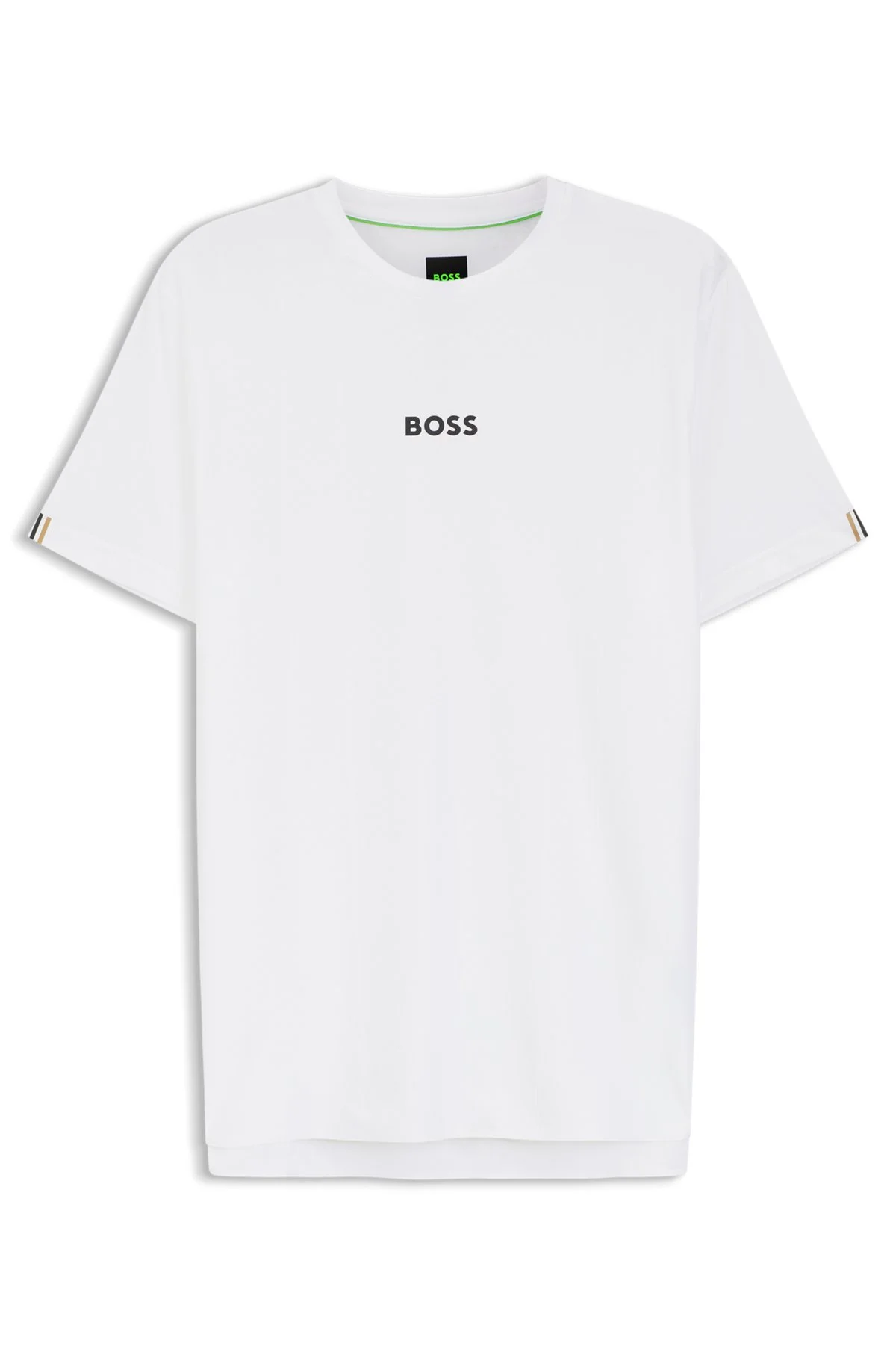 SIZE AND FIT Slim fit The model wears a size M and is 6'0" tall with a, 36" chest, 31" waist and 35" hips. DETAILS With quick-dry and moisture-wicking properties, this slim BOSS Menswear T-shirt is cut in comfortable stretch fabric. Logo print and jacquard stripe. Slim fit Neckline: Crew neck Short sleeves Standard length TS_TOC Serve 1 - 50559199 QUALITY & CARE INSTRUCTIONS Iron Low Heat Material: 91% Polyester, 9% Elastane Do Not Bleach Do Not Tumble Dry Do Not Dry Clean Machine Wash Cold Gentle