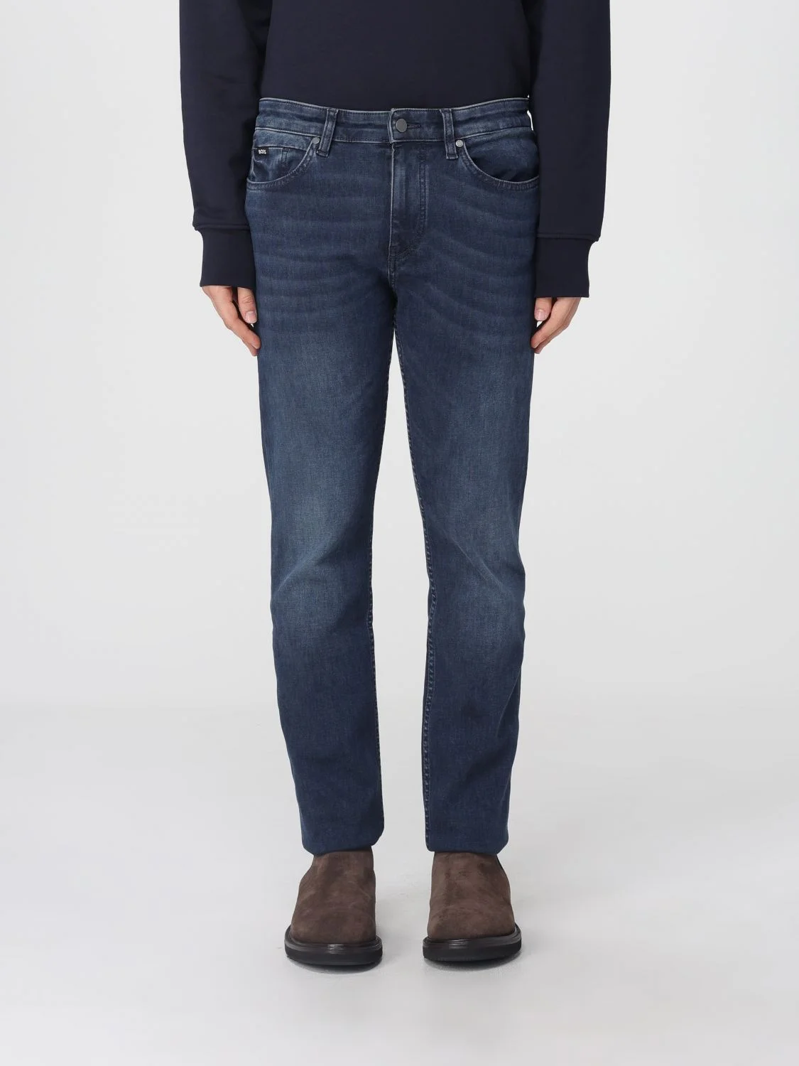 DESCRIPTION - Style: Casual - Pockets: 5-pocket - Waist: Medium, With loops - Bottom: With straight hemline - Closure: With button and zip - Materials: Denim - Pattern: Plain-colored DETAILS AND CARE Composition _ SIZE AND FIT Sizes not available Size and fit Slim fit Designer code: 50549834 425 Giglio Code: H53717 Designer: Boss Collection: Boss Men Category: Clothing Boss