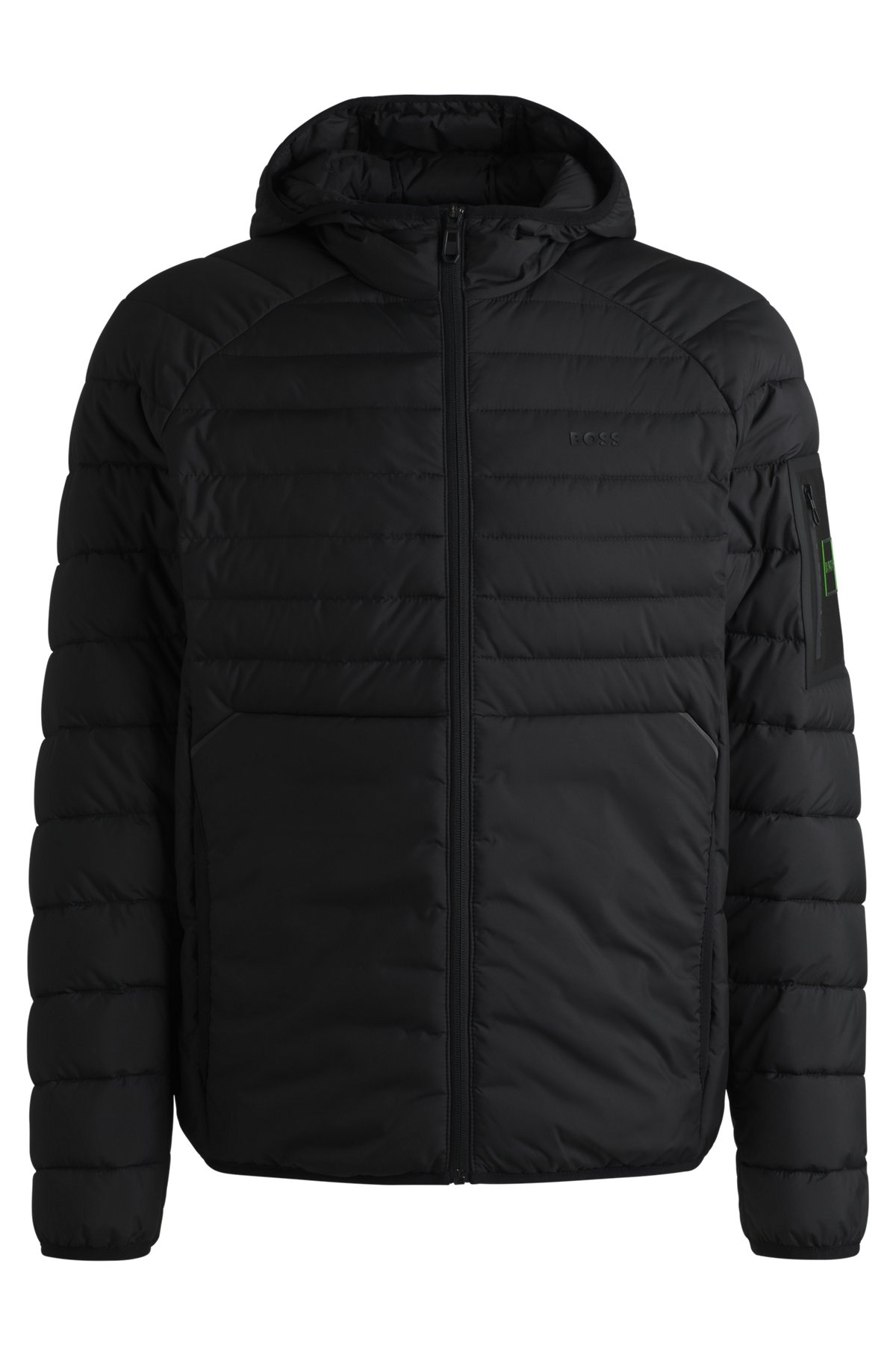 SIZE AND FIT The model wears a size M and is 6'2" tall with a, 36" chest, 31" waist and 38" hips. DETAILS J_Thor 2 - 50514761 A regular-fit hooded jacket with decorative reflective details and signature branding by BOSS. This water-repellent piece is padded for lightweight insulation. Regular fit Hooded collar Fastening top: Zip closure Pockets top: Side-entry pockets Elasticized cuffs No vent Fully lined Standard length Fit back length: 69 cm (27 inches) QUALITY & CARE INSTRUCTIONS Quality: 100% Polyester, Filling: 100% Polyester, Wadding: 100% Polyester (70% recycled) Do Not Bleach Do Not Tumble Dry very mild professional wet clean Do Not Dry Clean Do Not Wash Iron Low Heat