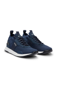 DETAILS Titanium_Runn_knst_N - 50498245 Signature trainers with branding throughout by BOSS. This knitted-upper pair features suede trims for hybrid style. This product is partly created with recycled polyester. We at HUGO BOSS prefer recycled polyester from pre- and post-consumer textile waste and do our best to phase out polyester from PET bottles. The aim of using recycled materials is to save valuable resources. Laces Unlined Packaging: Box QUALITY & CARE INSTRUCTIONS Upper material: 85% Polyester, 15% Elastane, Lining: 85% Polyester, 15% Polyurethane, 85% Polyester, 15% Elastane, Sole: 70% Ethylene vinyl acetate, 30% Rubber, Facing: 100% Cow leather, Innersole: 48% Polyester, 48% Viscose (Bamboo - Cellulose), 4% Polyurethane