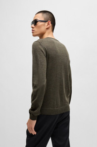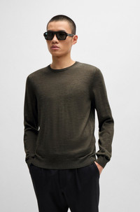 SIZE AND FIT The model wears a size M and is 6'2" tall with a, 34" chest, 28" waist and 37" hips. DETAILS Leno-P - 50468239 A soft and breathable sweater by BOSS Menswear. Cut to a slim fit, this crew-neck layer is crafted in merino wool. Neckline: Crew neck Long sleeves Standard length QUALITY & CARE INSTRUCTIONS Do Not Tumble Dry Dry Clean Only Iron Medium Heat Do Not Bleach Cold, gentle machine wash; reduced spin speed. Quality: 100% Virgin wool