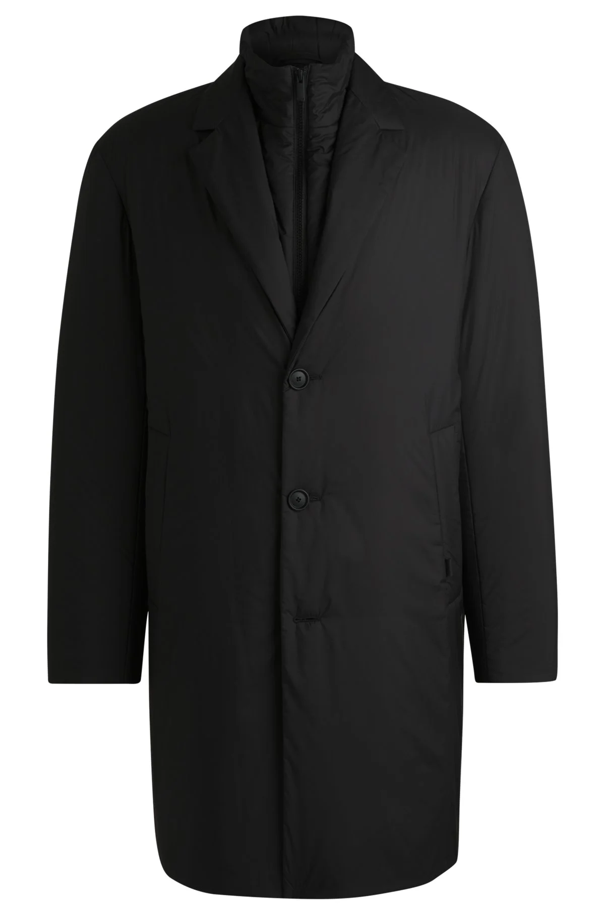 SIZE AND FIT The model wears a size 38R and is 6'1" tall with a, 0" chest, 31" waist and 37" hips. DETAILS P-Cale-Bib-Pad-244 - 50529745 This BOSS Menswear coat is filled with highly insulating yet super-lightweight, breathable padding, including a layer of duck down. It combines the stylings of a classic single-breasted coat with innovative details – including a water-repellent finish and a protective lining with a zipped high neck. Relaxed fit Fully lined Fit back length: 96 cm (38 inches) QUALITY & CARE INSTRUCTIONS Quality: 100% Polyester, Lining: 100% Polyester, pocketing: 100% Cotton, Wadding: 50% Duck down, 35% Polyester, 15% materialcode.PET Do Not Tumble Dry Do Not Bleach Wash Do Not Wash Iron Low Heat Do Not Dry Clean