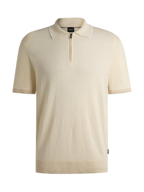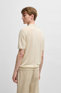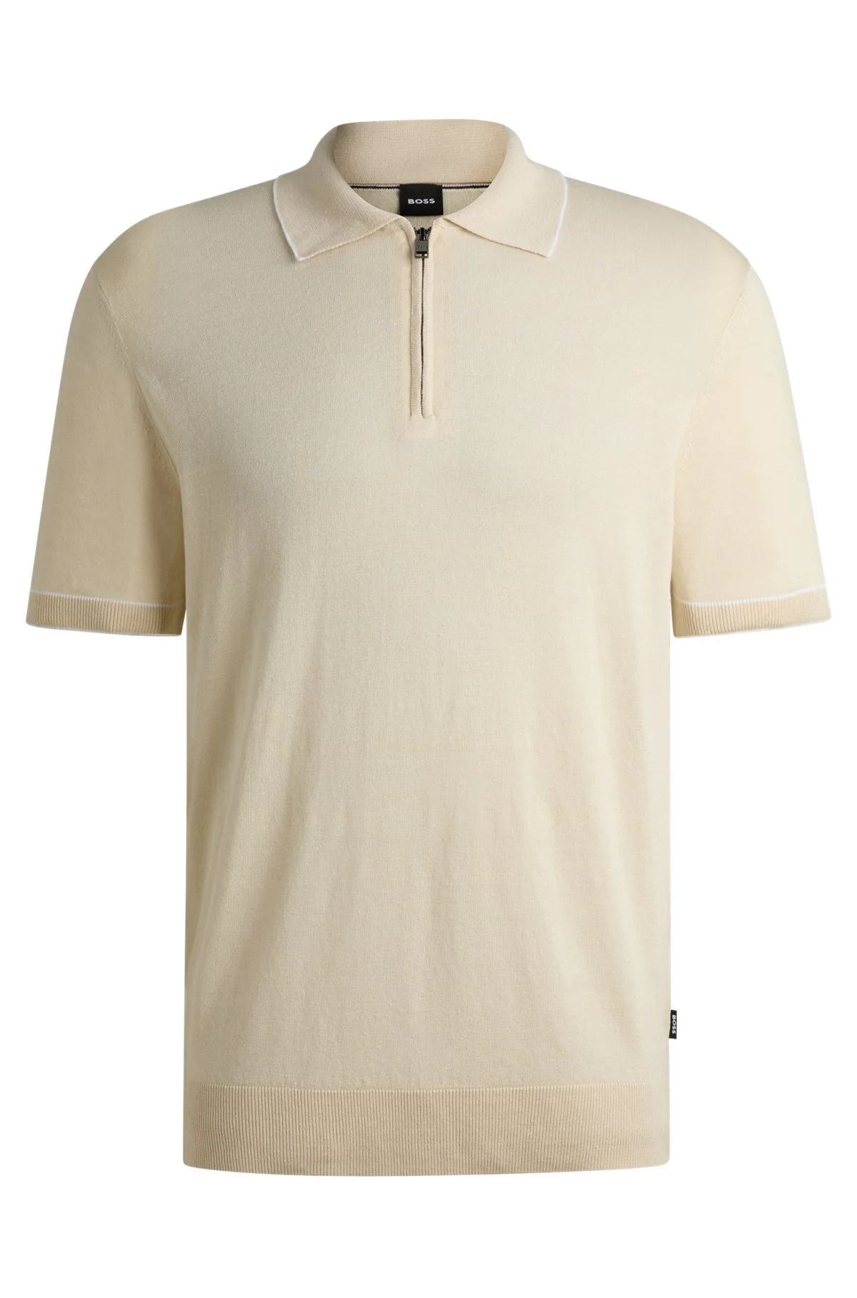 SIZE AND FIT The model wears a size M and is 6'1" tall with a, 32" chest, 28" waist and 34" hips. DETAILS H-Jiovanotto - 50537640 With tipping and a sporty zip placket, this BOSS Menswear sweater is a casual must. Cut to a straight fit in a summery blend. Regular fit Neckline: Zip neck Short sleeves Standard length QUALITY & CARE INSTRUCTIONS Quality: 56% Linen, 44% Viscose (10% recycled) Do Not Tumble Dry Do Not Bleach Cold, gentle machine wash; reduced spin speed. Reduced Dry Clean Iron Low Heat