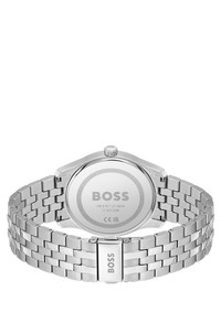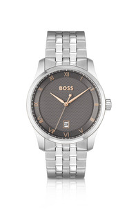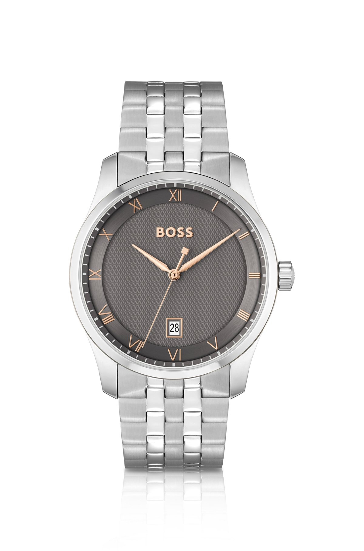 DETAILS PRINCIPLE - 58130038 An elegant link-bracelet watch with domed mineral glass by BOSS, set with a gray dial featuring a stamped pattern and Roman-numeral indexes. Watch mechanism: Three-hand Dial color: Grey Strap material: Stainless steel Closure: Push-button deployment Case size: 1.61 in (41 mm) (0 inches) Water Resistance (in ATM): 3 ATM QUALITY & CARE INSTRUCTIONS Quality: 100% Stainless steel