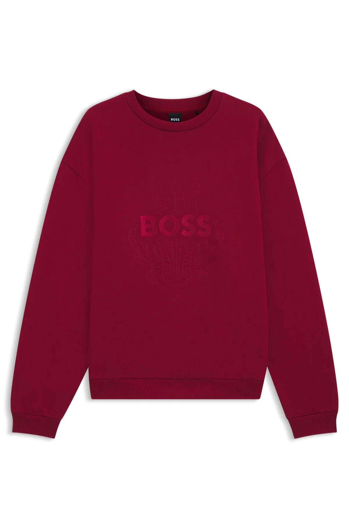 SIZE AND FIT The model wears a size M and is 6'2" tall with a, 37" chest, 26" waist and 35" hips. DETAILS With intricate embroidery celebrating the Year of the Horse, this branded BOSS Menswear sweatshirt is a statement way to layer. Oversize fit Soft cotton terry. Oversized fit Neckline: Crew neck Hong_CNY - 50556433 QUALITY & CARE INSTRUCTIONS Do Not Bleach Do Not Dry Clean Do Not Tumble Dry Material: 100% Cotton, Cuff / Waistband: 97% Cotton, 3% Elastane Iron Low Heat Machine Wash Cold Gentle