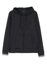 logo-embossed hoodie Highlights - Dark blue - Front zip fastening - Front pouch pocket - Drawstring hood Imported Composition Cotton 62%, Polyester 33%, Elastane 5% Washing instructions Machine Wash