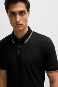 SIZE AND FIT The model wears a size M and is 6'1" tall with a, 36" chest, 29" waist and 34" hips. DETAILS Parlay 190 - 50494697 A signature polo shirt by BOSS. Cut to a straight fit in pique fabric, this top features a logo and contrast accents. Regular fit Neckline: Polo collar Number of buttons: 3 Short sleeves Standard length QUALITY & CARE INSTRUCTIONS Machine Wash Cold Gentle Do Not Tumble Dry Iron Low Heat Quality: 100% Cotton Do Not Bleach Do Not Dry Clean