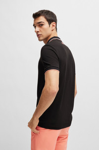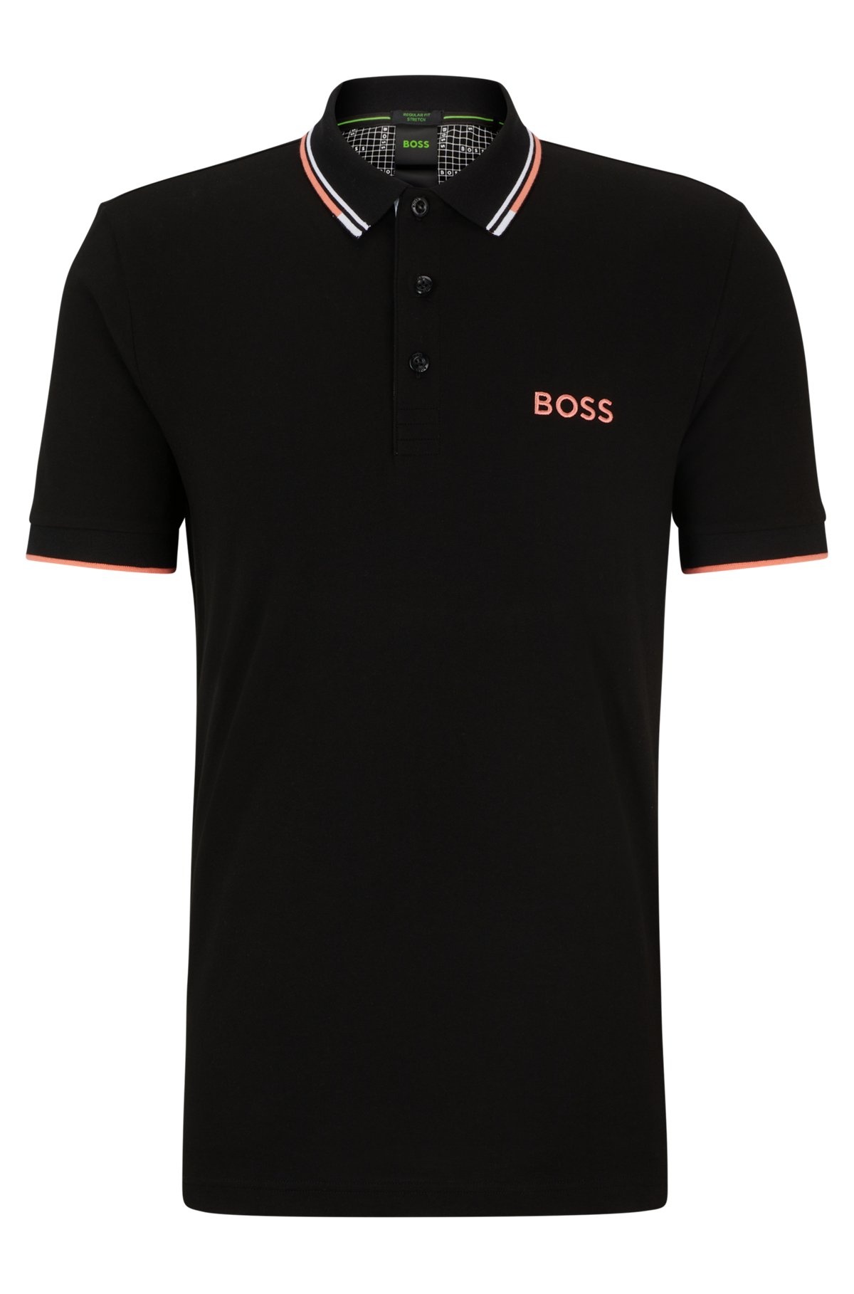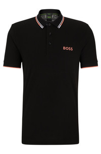 SIZE AND FIT The model wears a size M and is 6'2" tall with a, 37" chest, 30" waist and 37" hips. DETAILS Paddy Pro - 50469102 A distinctive polo shirt cut to a regular fit, by BOSS Menswear. Featuring contrast branding at the left chest and back neck, this short-sleeved polo shirt is designed in fabric with S.Cafe® and stretch for casual comfort. 3D stripes add a sporty touch at the collar and cuffs. S.Cafe® fabric is made from coffee grounds, transformed by a patented process into a special yarn. This fabric provides exceptional wearing comfort coupled with permanent performance benefits including fast drying and odor control. Regular fit Neckline: Flat-knit collar Number of buttons: 3 Short sleeves Flat-knit cuffs Standard length QUALITY & CARE INSTRUCTIONS Do Not Tumble Dry Iron Low Heat Do Not Bleach Machine Wash Cold Gentle Do Not Dry Clean Quality: 56% Cotton, 39% Polyester, 5% Elastane