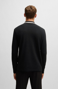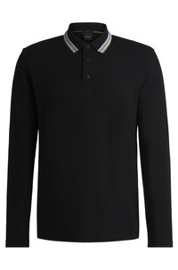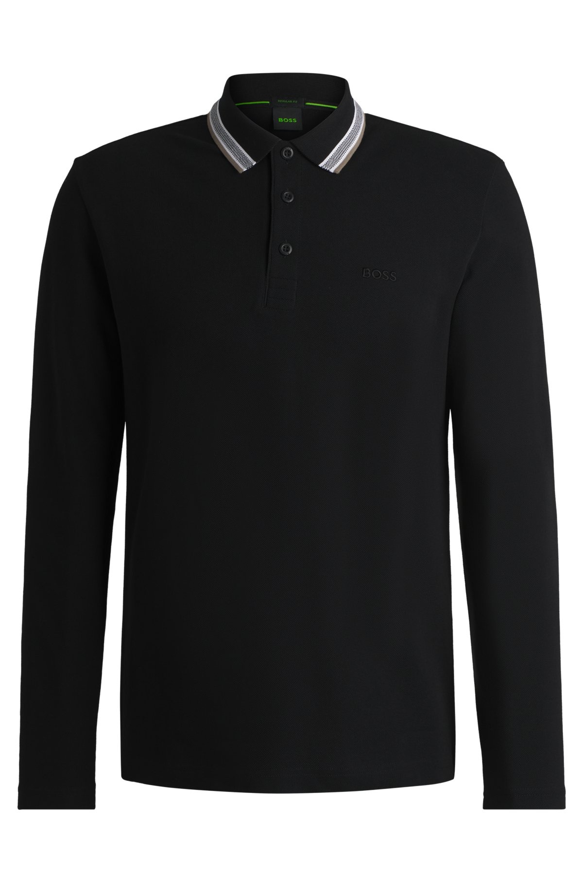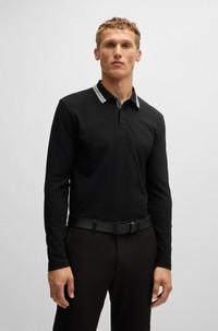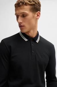 SIZE AND FIT The model wears a size M and is 6'2" tall with a, 36" chest, 31" waist and 38" hips. DETAILS Plisy - 50506191 A breathable polo shirt with a striped collar and contrast logo by BOSS Menswear. This top is cut to a straight fit in pique fabric. Regular fit Neckline: Flat-knit collar Number of buttons: 3 Long sleeves Flat-knit cuffs Standard length QUALITY & CARE INSTRUCTIONS Do Not Bleach Do Not Tumble Dry Do Not Dry Clean Iron Low Heat Machine Wash Cold Gentle Quality: 100% Cotton