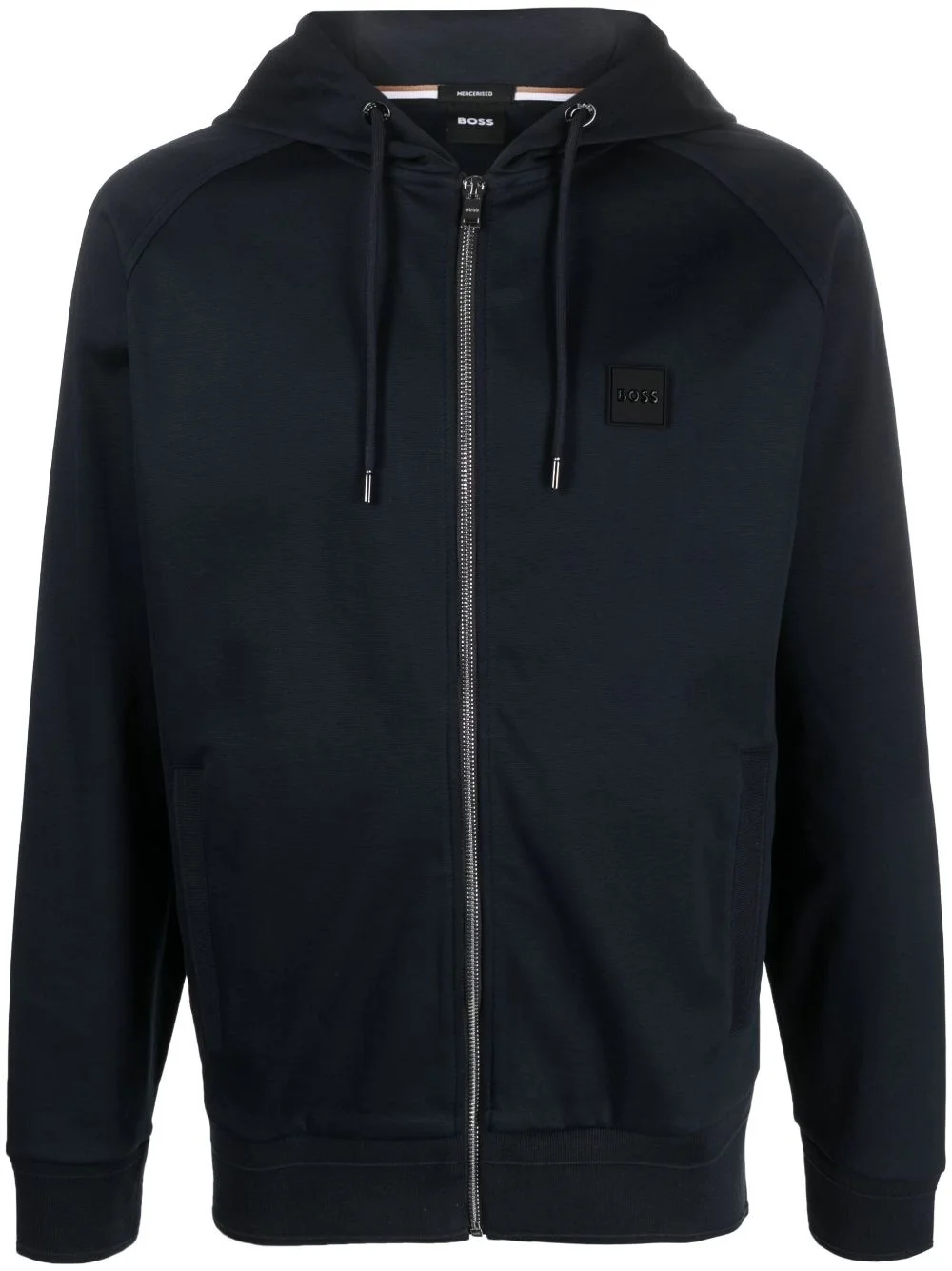 logo-patch drawstring hoodie Highlights - Navy blue - Cotton blend - Logo patch at the chest - Drawstring hood - Front zip fastening - Long sleeves - Ribbed cuffs and hem - Two side slit pockets - Straight hem Imported Composition Cotton 73%, Polyester 27% SIZE & FIT Model measurements Height 6 ft 1 in(1.85 m) Bust/Chest 35.82 in(91 cm) Hips 37.79 in(96 cm) Waist 29.13 in(74 cm) Measurement CHEST 46.45 in(118 cm) LENGTH 27.16 in(69 cm) FittingInformation Designed to be unstructured, offering a loose fit throughout Made from a midweight non-stretch fabric, this piece offers minimal elasticity when worn This piece fits true to size – take your usual size