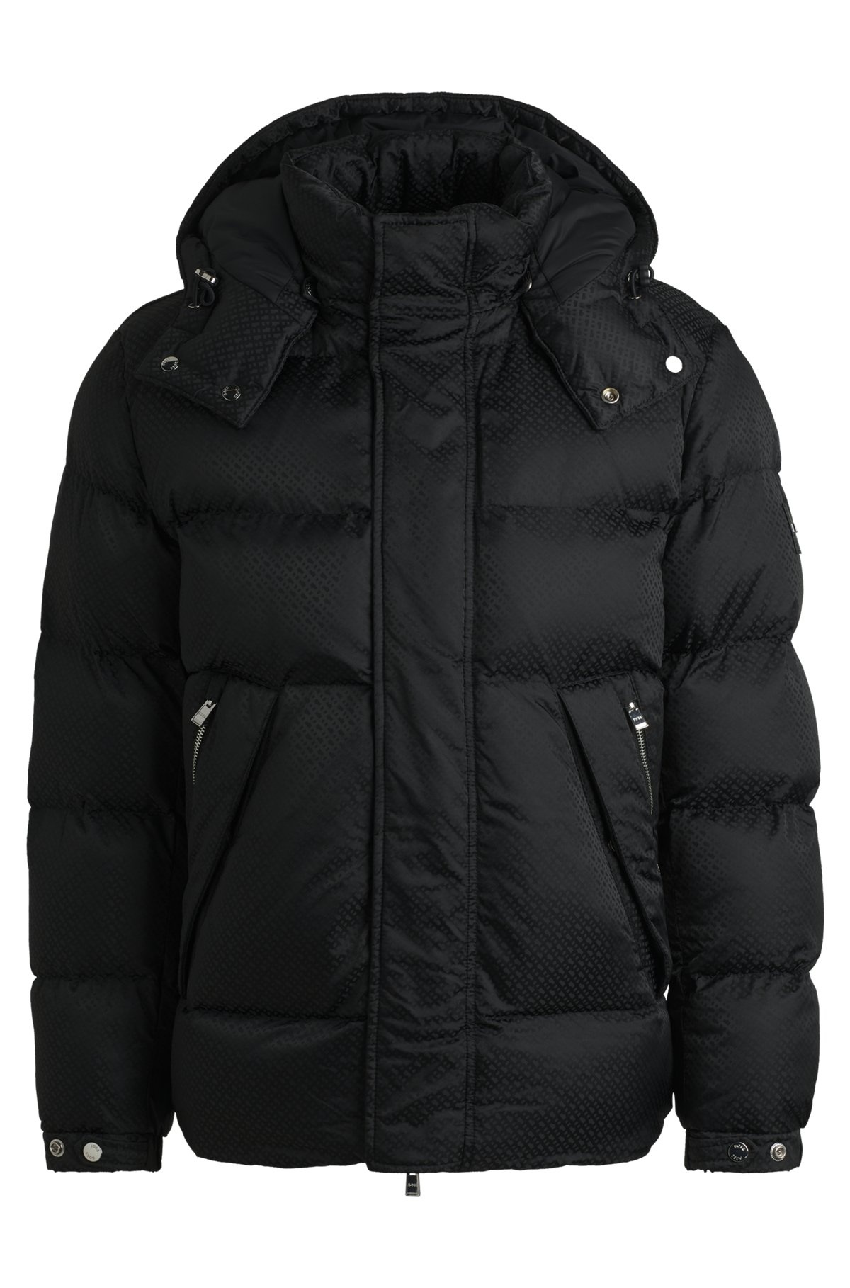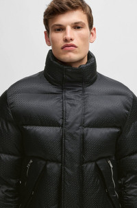 SIZE AND FIT The model wears a size 38R and is 6'2" tall with a, 39" chest, 30" waist and 36" hips. DETAILS H-Corbinian4 - 50525364 A water-repellent puffer jacket in a straight fit by BOSS. Featuring a detachable hood, this signature piece is jacquard-woven with micro monograms. Regular fit Detachable hood Stand collar Fastening top: Zip and button closure Number of buttons: 4 or more buttons Pockets top: Flap pockets Inside zip pockets Adjustable cuffs Fully lined Standard length Fit back length: 74 cm (29 inches) QUALITY & CARE INSTRUCTIONS Iron Low Heat Do Not Wash Quality: 100% Polyamid, Lining: 100% Polyamid, Wadding: 100% Polyester very mild professional wet clean Do Not Bleach Do Not Tumble Dry Do Not Dry Clean