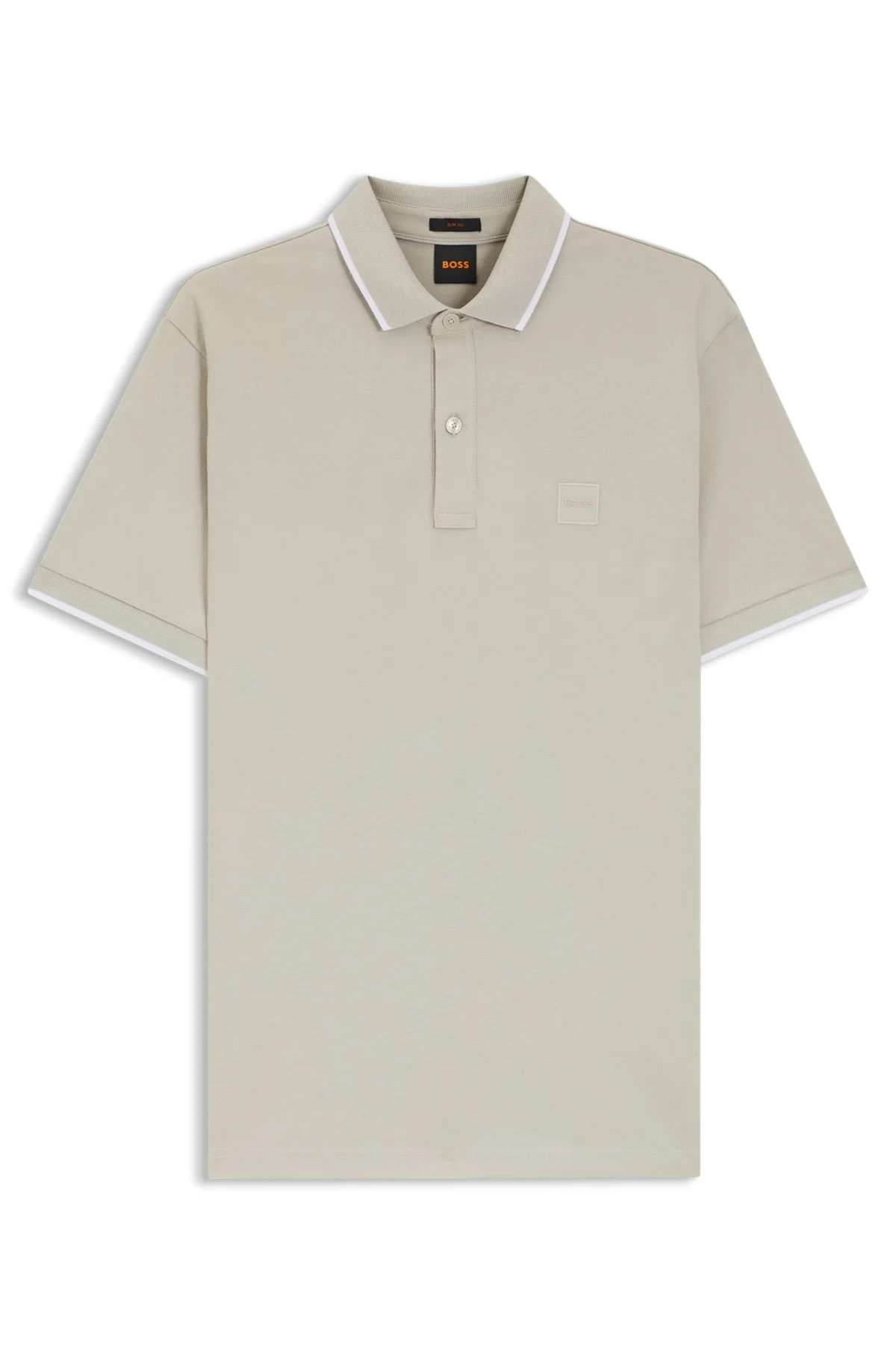 DETAILS An effortless polo shirt by BOSS Menswear, featuring a logo patch and contrast tipping. Slim fit Crafted in washed stretch-cotton pique for softness. Slim fit Neckline: Polo collar Number of buttons: 3 Short sleeves Passertip - 50507699 QUALITY & CARE INSTRUCTIONS Do Not Bleach Do Not Dry Clean Material: 95% Cotton, 5% Elastane Do Not Tumble Dry Iron Low Heat Machine Wash Cold Gentle