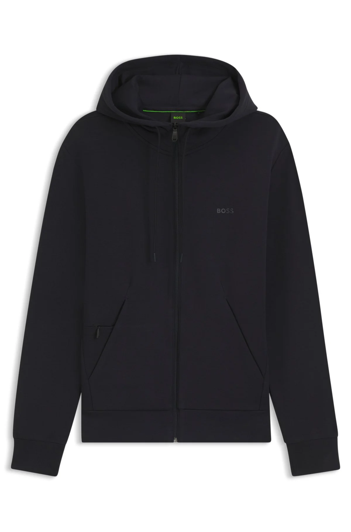 SIZE AND FIT The model wears a size L and is 6'2" tall with a, 38" chest, 31" waist and 37" hips. DETAILS Saggy - 50506161 A regular-fit zip-up hoodie created in stretch material with an HD logo print at the left chest by BOSS Menswear. Regular fit Neckline: Hooded Fastening top: Zip closure Zip chest pockets Pockets top: Side-entry pockets Long sleeves Ribbed cuffs Standard length QUALITY & CARE INSTRUCTIONS Iron Low Heat Quality: 95% Cotton, 5% Elastane Machine Wash Cold Gentle Do Not Bleach Do Not Tumble Dry Do Not Dry Clean