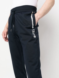 logo-print slim tapered track pants Highlights - Navy blue - Cotton blend - Logo print to the side - Elasticated drawstring waistband - Two side slit pockets - Tapered leg - Elasticated ankles - When buying this unisex item, keep in mind that it is graded in standard men's sizing. Imported Composition Cotton 70%, Polyester 30% SIZE & FIT Model measurements Height 6 ft 2 in(1.88 m) Bust/Chest 36.22 in(92 cm) Hips 36.61 in(93 cm) Waist 29.52 in(75 cm) FittingInformation This piece is unisex. Please take care when selecting your size Designed for a slim fit for men and a loose fit for women Made with a mid-weight fabric Washing instructions Machine Wash