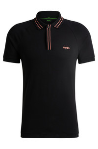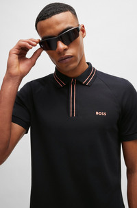 SIZE AND FIT The model wears a size L and is 6'1" tall with a, 37" chest, 29" waist and 37" hips. DETAILS Paule 2_NCSA - 50514854 A logo-detail polo shirt with contrast stripes by BOSS Menswear, cut to a slim fit in stretch cotton with pointelle sleeves. Slim fit Neckline: Flat-knit collar Number of buttons: 3 Short sleeves Flat-knit cuffs Standard length QUALITY & CARE INSTRUCTIONS Quality: 95% Cotton, 5% Elastane, Sleeve: 75% Cotton, 25% Polyester Do Not Tumble Dry Do Not Bleach Do Not Dry Clean Machine Wash Cold Gentle Iron Low Heat