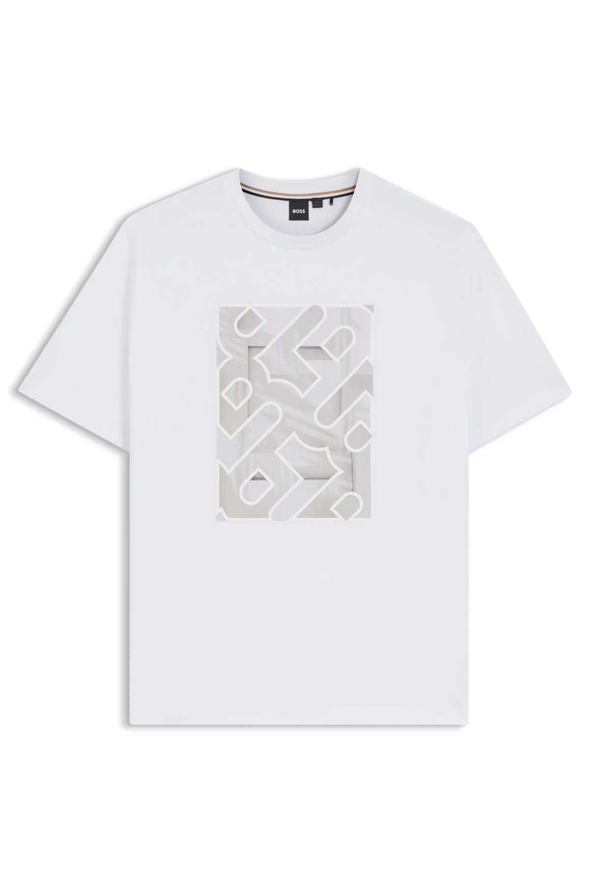 DETAILS Add impact to casual looks with the modern monogram artwork of this BOSS Menswear T-shirt. Cut to a straight fit in soft cotton jersey. Regular fit Neckline: Crew neck Short sleeves BT_Taut 81 - 50548409 QUALITY & CARE INSTRUCTIONS Do Not Tumble Dry Iron Low Heat Do Not Dry Clean Machine Wash Cold Gentle Do Not Bleach Quality: 100% Cotton