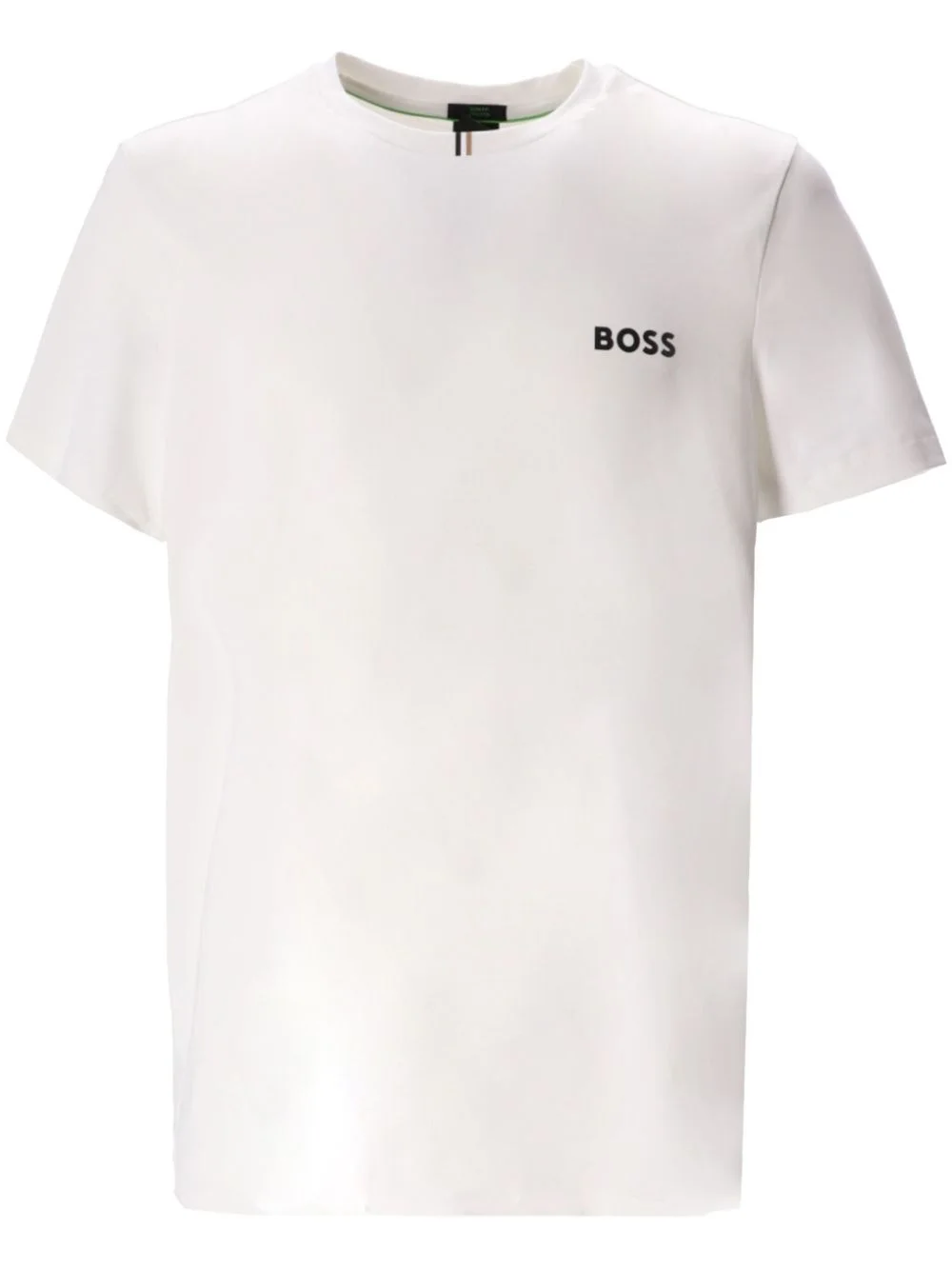 logo-print T-shirt Highlights - White - Round neck - Short sleeves - Straight hem Imported Composition Recycled Polyester 93%, Elastane 7% SIZE & FIT FittingInformation Designed for a slim fit, this performance top offers a close fit that sits just away from the body allowing for movement Made from a midweight stretch fabric, this piece offers elasticity and flexibility when worn