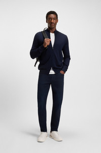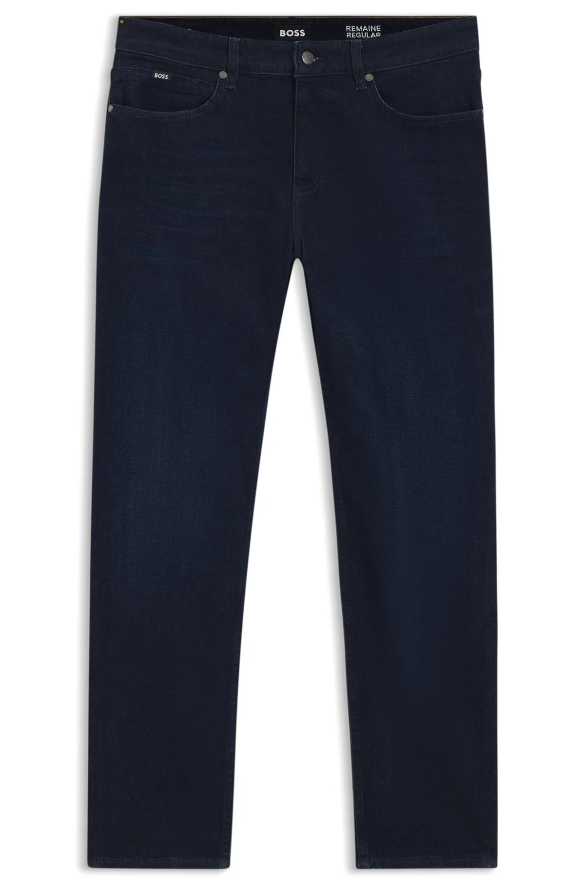 SIZE AND FIT The model wears a size 32/32 and is 6'1" tall with a, 36" chest, 29" waist and 34" hips. DETAILS H-Re.Maine - 50523240 Straight-fit jeans with a tapered leg by BOSS. This regular-rise pair is crafted in super-soft denim with a versatile dark-blue color. Regular fit Regular rise Button and zip closure Pockets bottom front: Side pockets Straight leg Pockets bottom back: Patch pocket Standard length QUALITY & CARE INSTRUCTIONS Do Not Dry Clean Do Not Bleach Machine Wash Cold Gentle Quality: 94% Cotton, 5% Elastomultiester, 1% Elastane Iron Medium Heat Do Not Tumble Dry