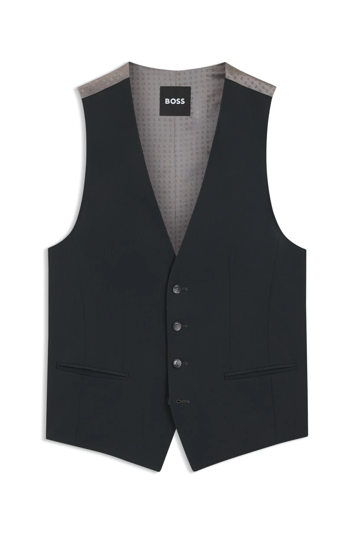 DETAILS With its clean slim fit and melange effect, this BOSS Menswear waistcoat gives endless styling options. Soft wool blend with added stretch. Branded lining. Slim fit Fastening top: Button closure Number of buttons: 4 or more buttons Pockets top: Welt pockets Fully lined H-Huge-Vest-MM-251 - 50557397 QUALITY & CARE INSTRUCTIONS Do Not Bleach Do Not Wash Iron Medium Heat Reduced Dry Clean Material: 57% Virgin wool, 40% Viscose, 3% Elastane, Lining: 100% Viscose Do Not Tumble Dry