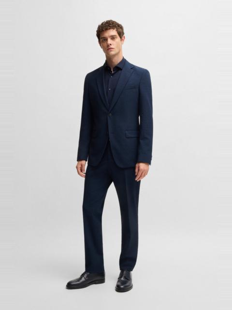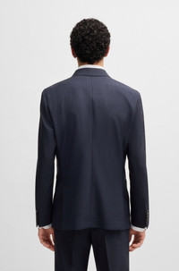 SIZE AND FIT The model wears a size 38R and is 6'1" tall with a, 32" chest, 28" waist and 34" hips. DETAILS C-Huge-2Pcs-DB-252 - 50540770 Secure a refined formal look with this BOSS Menswear suit. Featuring a modern double-breasted jacket, this suit is crafted in wool that has natural stretch for comfort in movement. The melange effect is easy to style. Relaxed fit Peaked lapels Fastening top: Button closure Number of buttons: Double-breasted Welt chest pockets Pockets top: Welt pockets Kissing buttons on the cuff Unlined Button closure Pockets bottom front: Side slash pockets Pockets bottom back: Welt pocket QUALITY & CARE INSTRUCTIONS Reduced Dry Clean Do Not Wash Iron Low Heat Do Not Bleach Do Not Tumble Dry Quality: 100% Virgin wool, Lining: 65% Viscose, 35% Polyester, Sleeve lining: 100% Viscose, knee lining: 100% Viscose