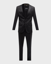 - BOSS Hugo Boss "Halven Gentry" two-piece tuxedo suit. - Approx. length: - 29"L down center back. - Satin peak lapel; one-button front. - Four-button detail at cuffs. - Front flap pockets; chest welt pocket. - Double-vented back. - Slim fit. - Flat-front trousers. - Satin trim down sides. - Unfinished hem to be tailored to desired length. - Wool. - Dry clean. - Made in Italy. - Size Note: Model height: 6'1"/185cm - Item runs small, consider ordering a size up.