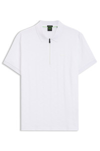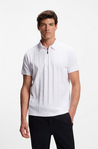 DETAILS Upgrade your active options with the moisture-managing mercerized cotton of this BOSS Menswear polo shirt. Dynamic jacquard pattern. Sporty zip placket. Relaxed fit. Relaxed fit Neckline: Flat-knit collar Fastening top: Zip closure Short sleeves Flat-knit cuffs Standard length PL_Mirror QZ - 50548653 QUALITY & CARE INSTRUCTIONS Do Not Tumble Dry Iron Low Heat Do Not Dry Clean Machine Wash Cold Gentle Do Not Bleach Quality: 100% Cotton