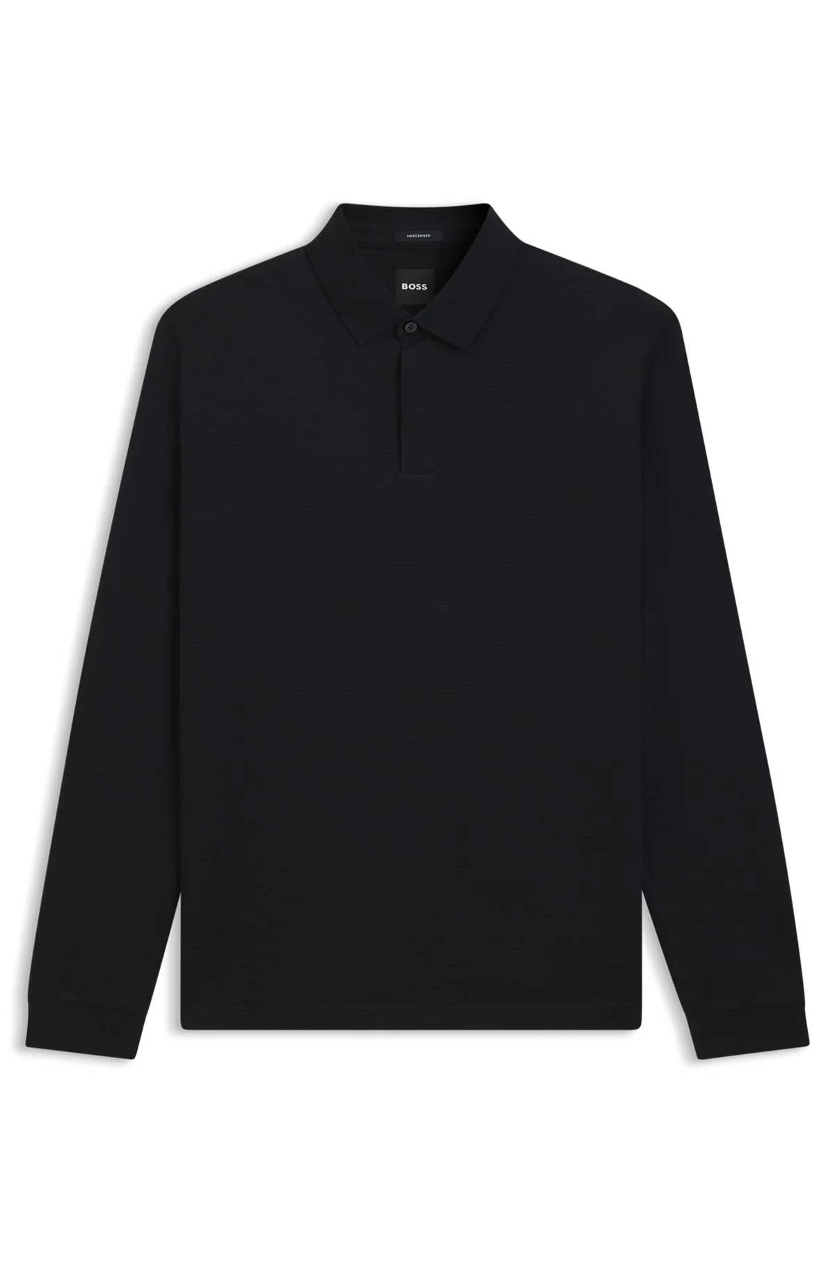DETAILS H-Pado 432 - 50544254 The rich structure of this BOSS Menswear polo shirt is offset by the plain collar. Straight fit with concealed closure. Extra-soft mercerized cotton. Regular fit Neckline: Polo collar Number of buttons: 2 Long sleeves Ribbed cuffs Side slit QUALITY & CARE INSTRUCTIONS Do Not Tumble Dry Machine Wash Cold Gentle Quality: 100% Cotton Reduced Dry Clean Iron Low Heat Do Not Bleach