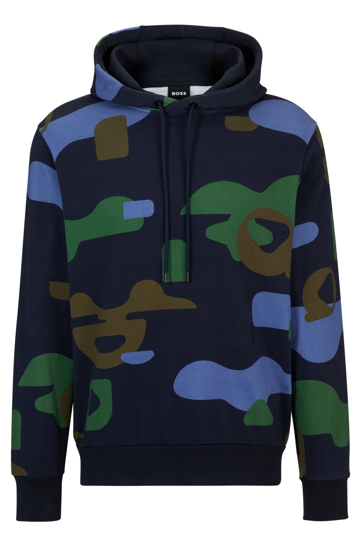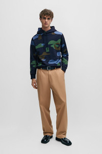 SIZE AND FIT The model wears a size M and is 6'2" tall with a, 35" chest, 27" waist and 35" hips. DETAILS Seeger 150 - 50510252 A signature hoodie by BOSS Menswear, cut to a regular fit in super-soft mercerised cotton with a seasonal pattern all over. Regular fit Long sleeves Standard length QUALITY & CARE INSTRUCTIONS Do Not Dry Clean Quality: 100% Cotton Iron Low Heat Cold, gentle machine wash; reduced spin speed. Do Not Tumble Dry Do Not Bleach
