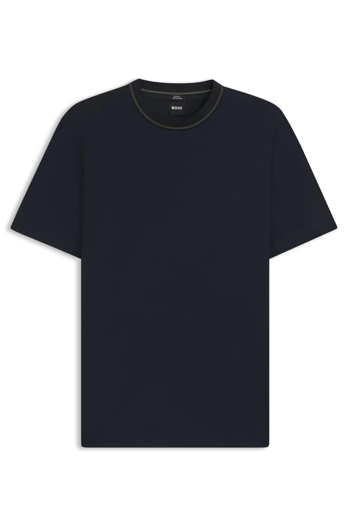 SIZE AND FIT The model wears a size M and is 6'1" tall with a, 36" chest, 28" waist and 36" hips. DETAILS H-Tessler 199 - 50531793 A slim-fit T-shirt by BOSS Menswear. Crafted in softened cotton, this top has a contrast stripe. A versatile piece to elevate weekend wear. Slim fit Neckline: Crew neck Short sleeves Standard length QUALITY & CARE INSTRUCTIONS Reduced Dry Clean Do Not Bleach Do Not Tumble Dry Quality: 100% Cotton Iron Low Heat Machine Wash Cold Gentle
