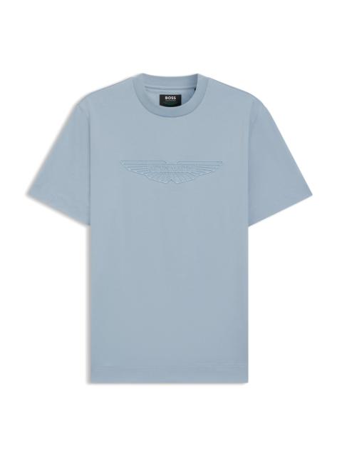 DETAILS Featuring a metallic Double B monogram badge, this BOSS Menswear T-shirt is crafted in cotton with a super-soft mercerized finish. Regular fit. Regular fit Neckline: Crew neck Short sleeves Standard length C-Taut 01 - 50555844 QUALITY & CARE INSTRUCTIONS Iron Low Heat Material: 100% Cotton Do Not Bleach Do Not Tumble Dry Do Not Dry Clean Machine Wash Cold Gentle