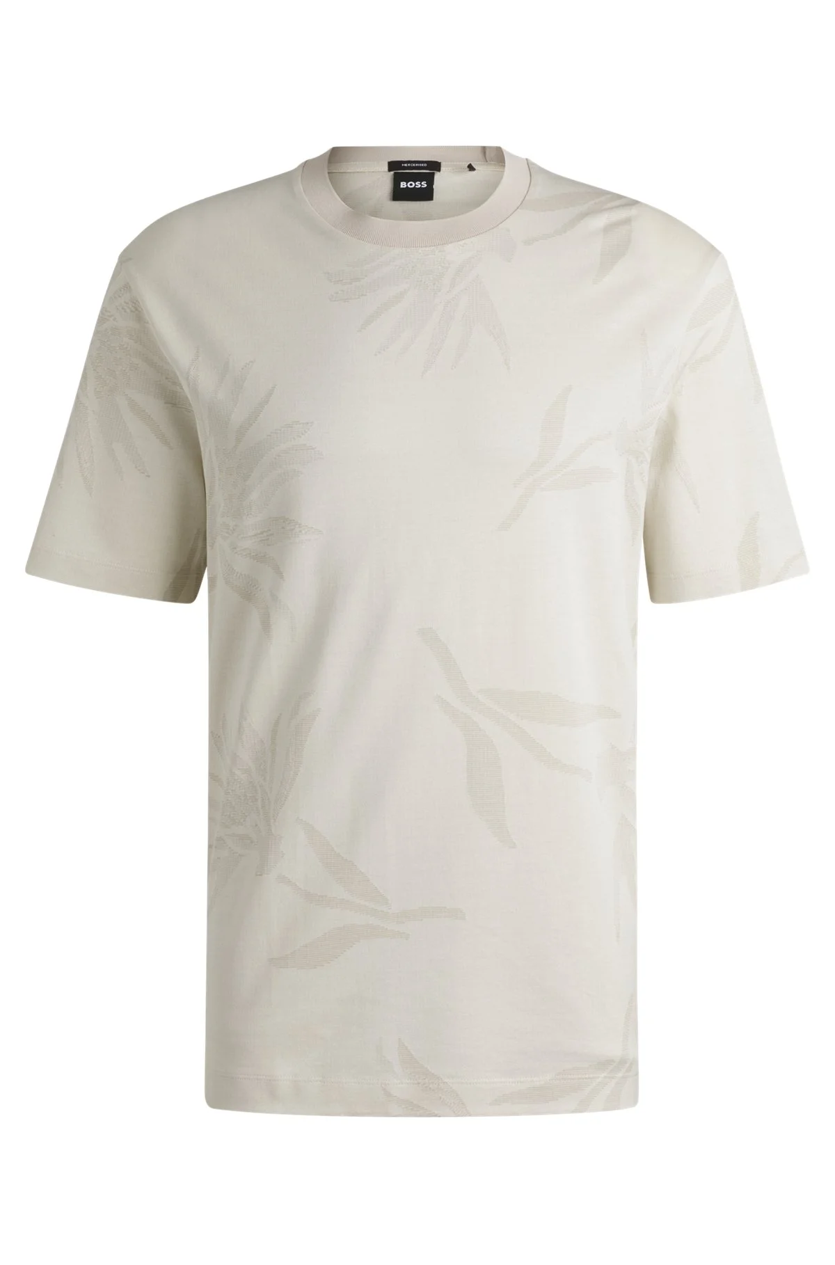 SIZE AND FIT The model wears a size M and is 6'1" tall with a, 37" chest, 29" waist and 35" hips. DETAILS C-Taut 13 - 50536757 With an extra-soft touch thanks to a mercerizing treatment, this straight-cut BOSS Menswear T-shirt is a refined casual choice. Modern floral jacquard. Regular fit Neckline: Crew neck Short sleeves Side slit QUALITY & CARE INSTRUCTIONS Iron Low Heat Do Not Bleach Machine Wash Cold Gentle Do Not Tumble Dry Quality: 100% Cotton Do Not Dry Clean