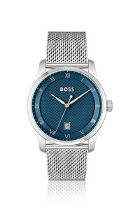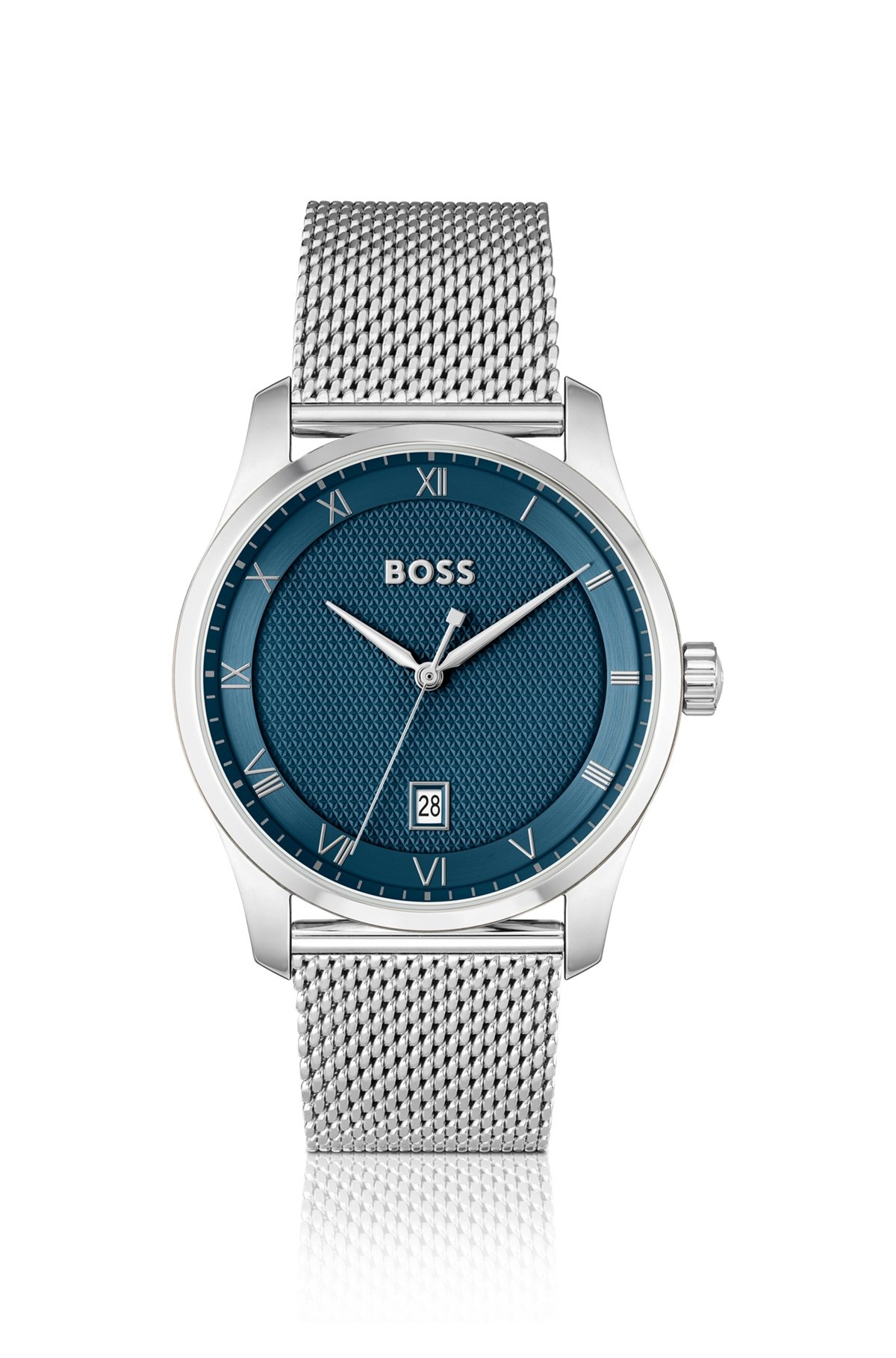 DETAILS PRINCIPLE - 58130066 A contemporary mesh-bracelet watch by BOSS, set with a blue textured dial featuring Roman-numeral indexes and domed mineral glass. Watch mechanism: Three-hand Dial color: Blue Strap material: Stainless steel Closure: BOSS clasp Case size: 1.61 in (41 mm) (0 inches) Water Resistance (in ATM): 3 ATM QUALITY & CARE INSTRUCTIONS Quality: 100% Stainless steel
