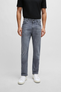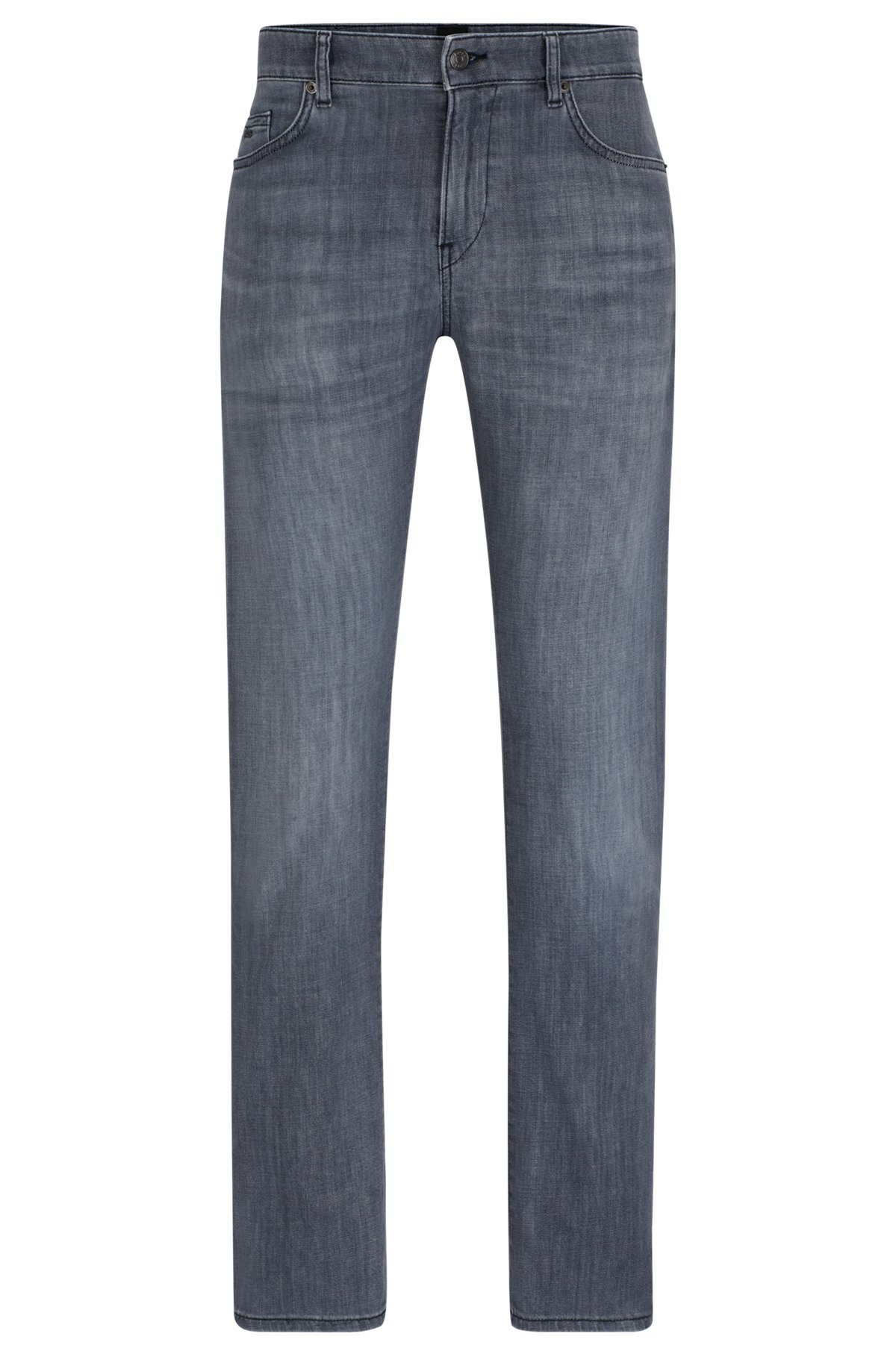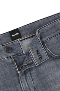 SIZE AND FIT The model wears a size EU:33 and is 6'1" tall with a, 36" chest, 29" waist and 34" hips. DETAILS Delaware3-1 - 50513619 Signature-trim jeans cut to a slim fit with a regular rise in comfort-stretch denim with a versatile blue tone by BOSS Menswear. Slim fit Regular rise Button and zip closure Pockets bottom front: Side pockets Slim leg Pockets bottom back: Patch pocket Standard length Fit foot width: 35,4 cm (13.9 inches) QUALITY & CARE INSTRUCTIONS Do Not Bleach Do Not Tumble Dry Iron Medium Heat Do Not Dry Clean Quality: 90% Cotton, 8% Elastomultiester, 2% Elastane Machine Wash Cold Gentle