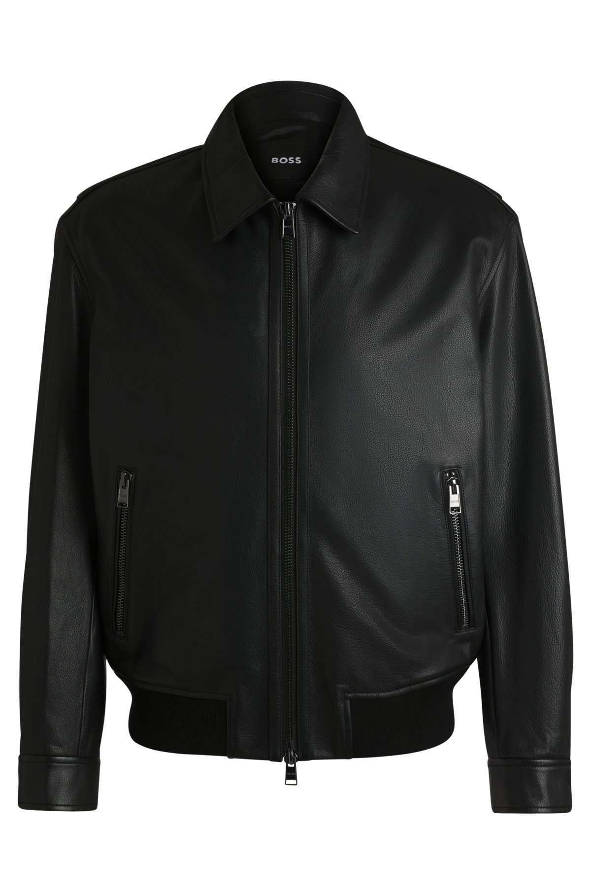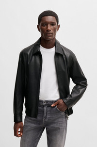 SIZE AND FIT The model wears a size 38R and is 6'0" tall with a, 35" chest, 27" waist and 36" hips. DETAILS C-Merwyn1 - 50532807 Crafted in leather milled to intensify its natural structure, this BOSS Menswear jacket has a two-way zip for adjustable styling. Layerable regular fit. Regular fit Shirt Collar Fastening top: Zip closure Pockets top: Zip pockets Inside zip pockets Adjustable cuffs Fully lined Standard length Fit back length: 66 cm (26 inches) QUALITY & CARE INSTRUCTIONS Do Not Tumble Dry Do Not Iron Do Not Wash Do Not Bleach Reduced Dry Clean Quality: 100% Cow leather, Lining: 54% Polyester, 46% Viscose, Knitwear: 72% Polyacrylic, 16% Wool, 7% Polyamid, 5% Elastane