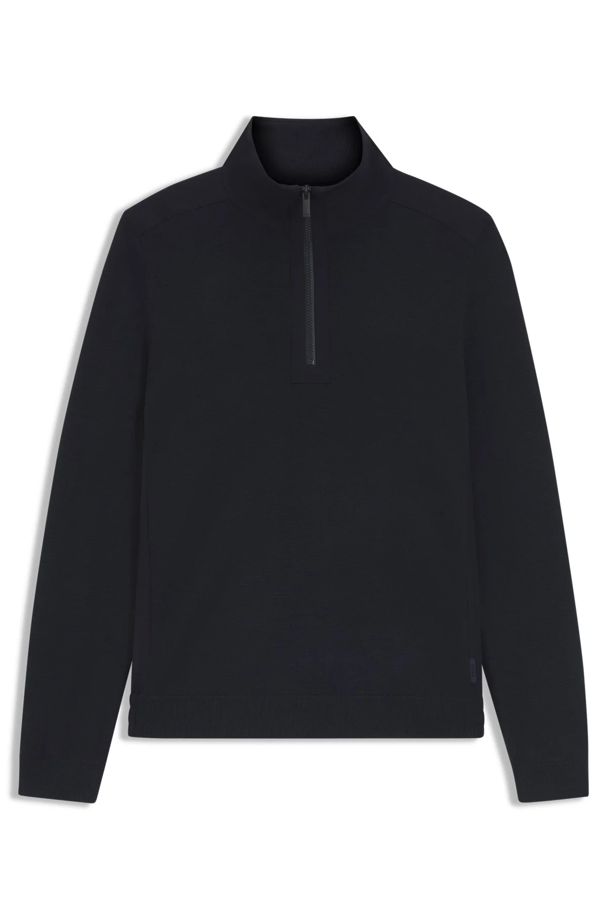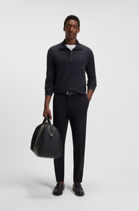 SIZE AND FIT The model wears a size M and is 6'2" tall with a, 37" chest, 29" waist and 37" hips. DETAILS P-Bart - 50531159 A quarter-zip sweater for adaptable layering by BOSS Menswear. This regular-fit top has knitted elements blended with wool offset by softshell trims. Regular fit Neckline: Zip neck Long sleeves Standard length QUALITY & CARE INSTRUCTIONS Iron Low Heat Machine Wash Cold Gentle Do Not Bleach Quality: 55% Polyester, 45% Virgin wool, Facing: 90% Polyamid, 10% Elastane, Insert: 90% Polyamid, 10% Elastane Do Not Tumble Dry Do Not Dry Clean