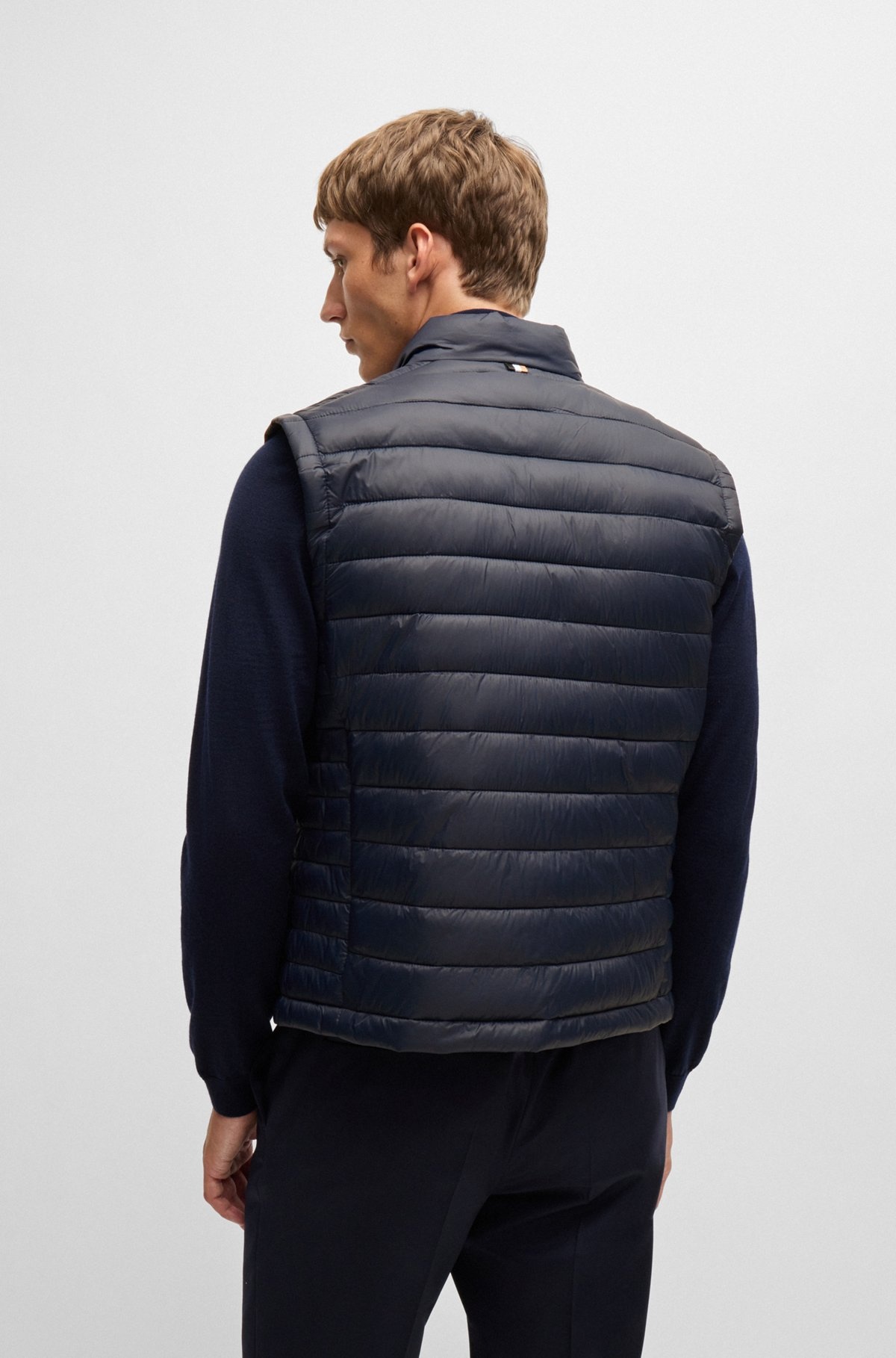 SIZE AND FIT The model wears a size 40R and is 6'2" tall with a, 36" chest, 28" waist and 37" hips. DETAILS Calano - 50471854 An ultra-lightweight gilet with a packable design by BOSS Menswear. Cut to a regular fit for easy layering, this water-repellent gilet is printed with a BOSS logo in a tonal effect at the left chest. Regular fit Stand collar Fastening top: Zip closure Number of buttons: 2 Pockets top: Welt pockets Inside zip pockets No cuffs Fully lined Standard length Fit back length: 64 cm (25 inches) QUALITY & CARE INSTRUCTIONS Do Not Tumble Dry Iron Low Heat Do Not Bleach very mild professional wet clean Do Not Dry Clean Quality: 100% Polyamid, Lining: 100% Polyamid, Filling: 100% Polyester Do Not Wash